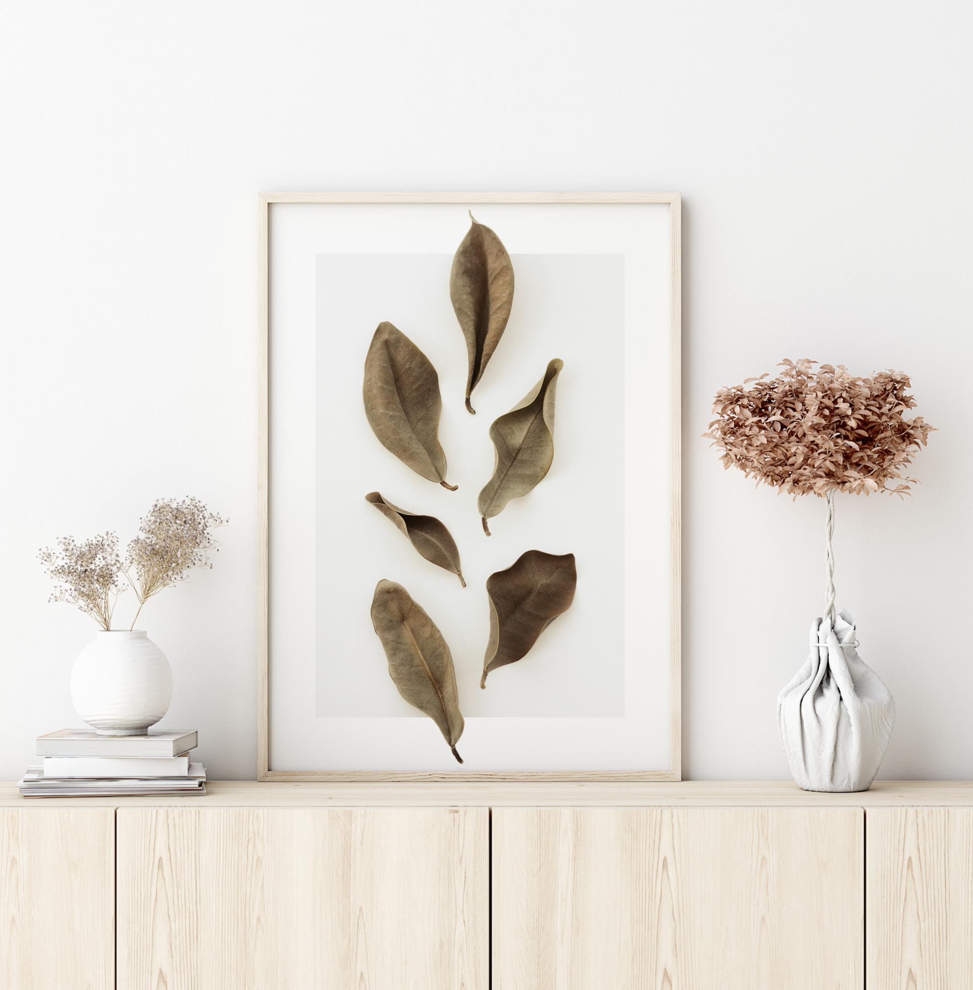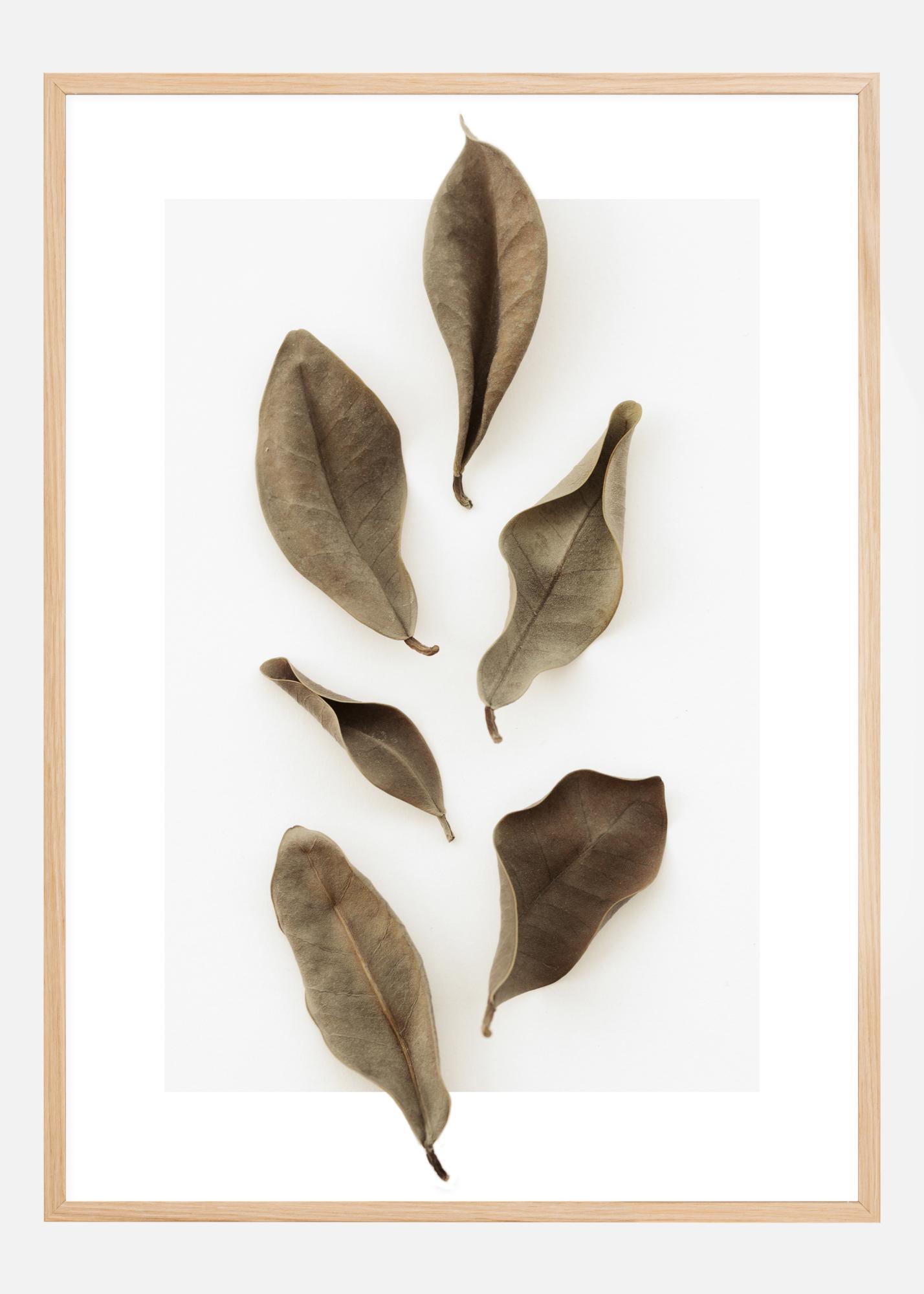 Yksityiskohtainen juliste muutamista kuivatuista lehdistä. Kuusi kuivattua lehteä on järjestetty ikään kuin ne olisivat vielä kiinni oksassa valkoisella taustalla. Ruskeat lehdet ovat yksinkertaisia, ja ne sopivat täydellisesti tehostamaan vilkasta seinää tai lisäämään kuviota yksinkertaiseen seinään.