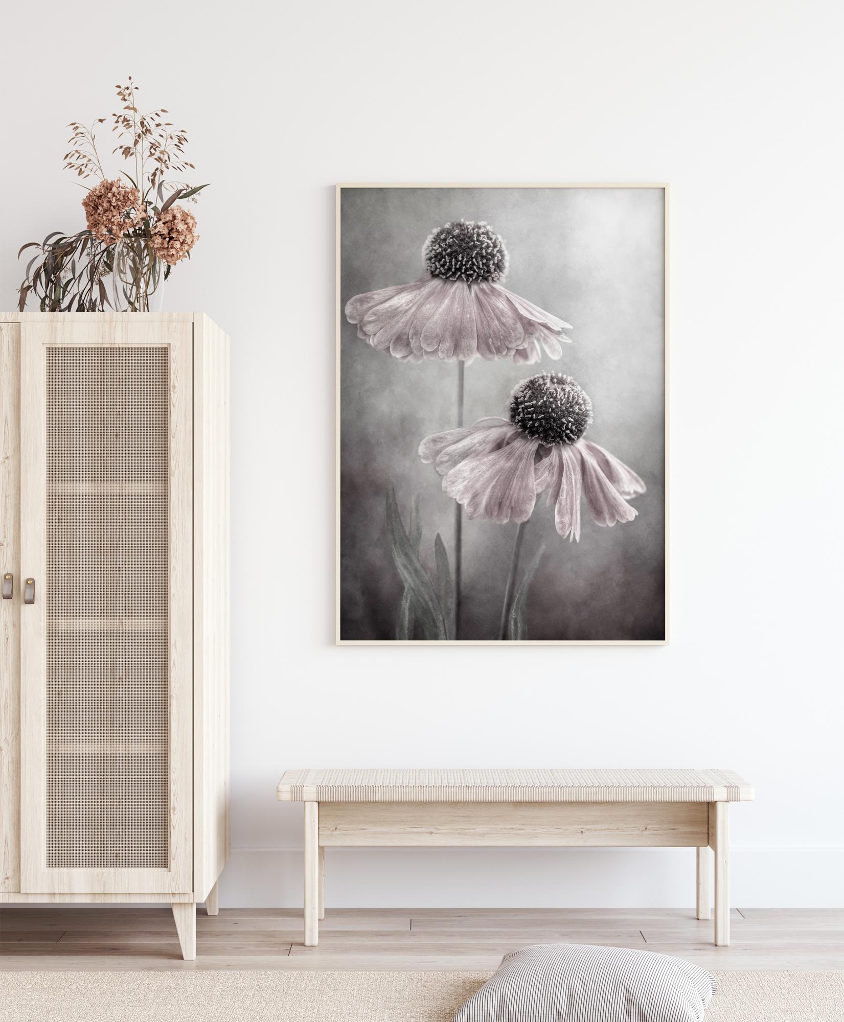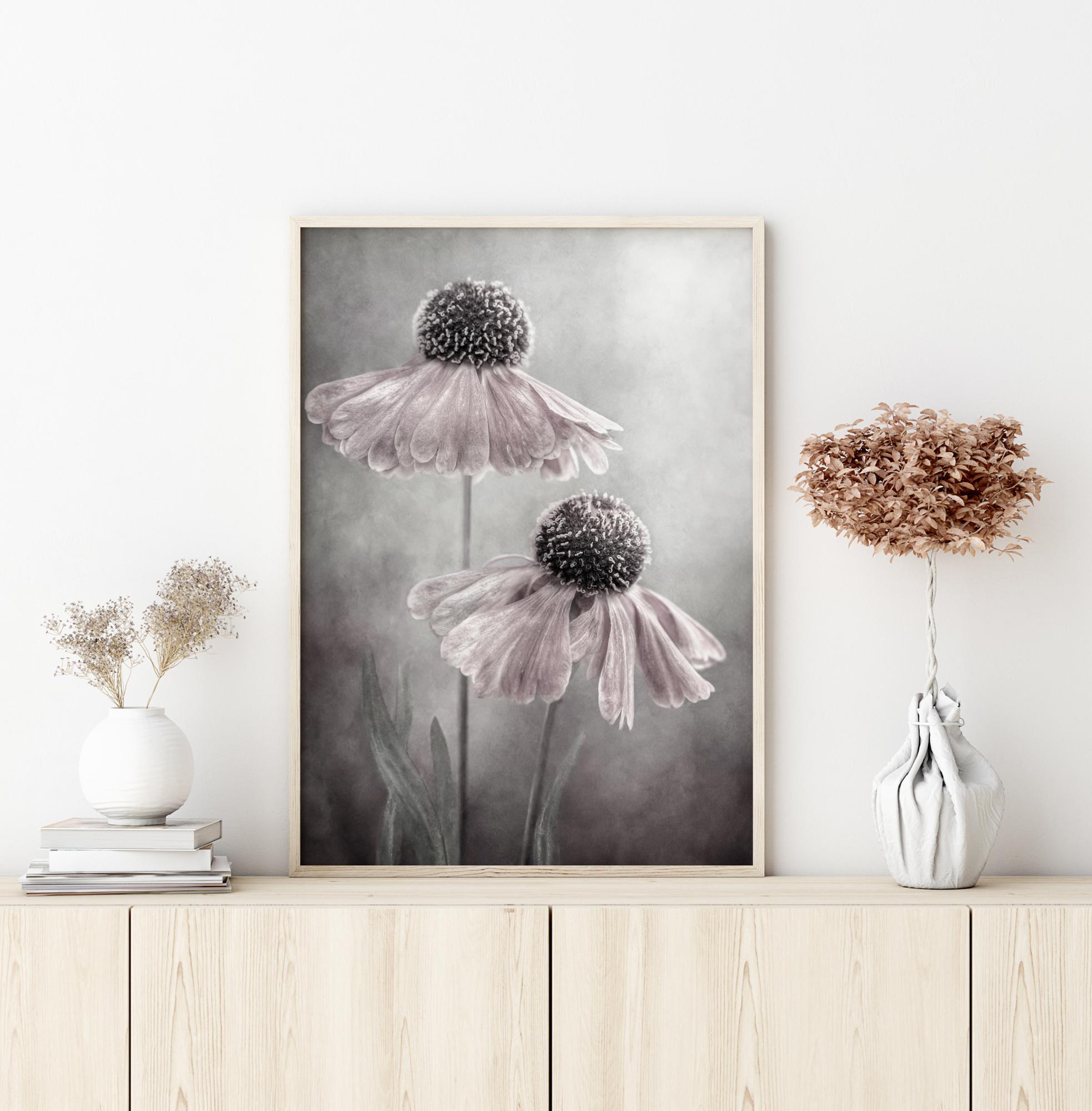 Kaunis juliste kahdesta päivänkakkarasta, kun ne kurottautuvat kohti taivasta. Kummankin päivänkakkaran pään valkoiset terälehdet roikkuvat alaspäin pallomaisen kukkakeskipisteen ympärille. Taustalla on sumuinen harmaa sävy, jonka läpi paistaa valo tunnelman luomiseksi. Tunne tämän herkän julisteen taika, kun ripustat sen makuuhuoneeseen.