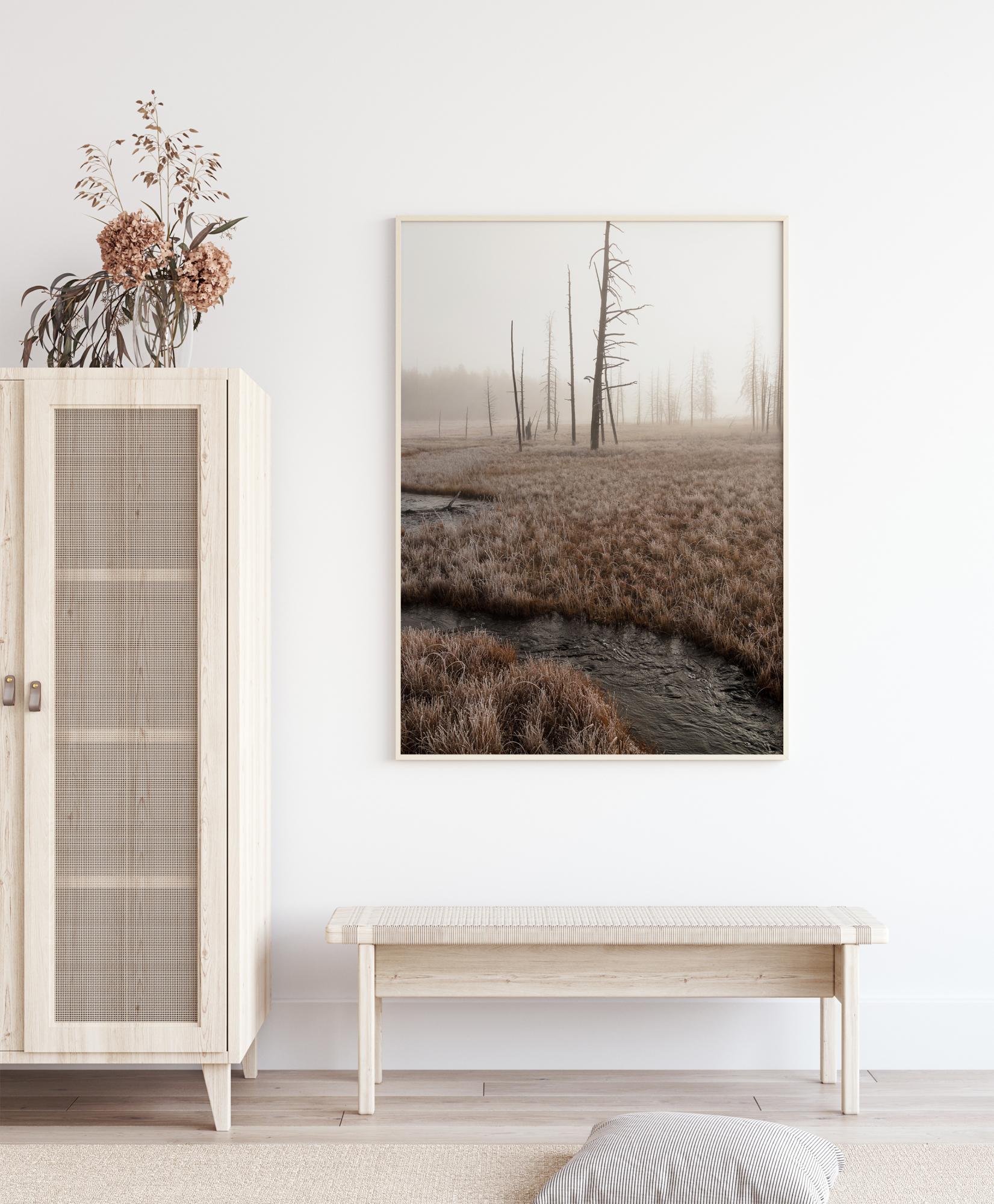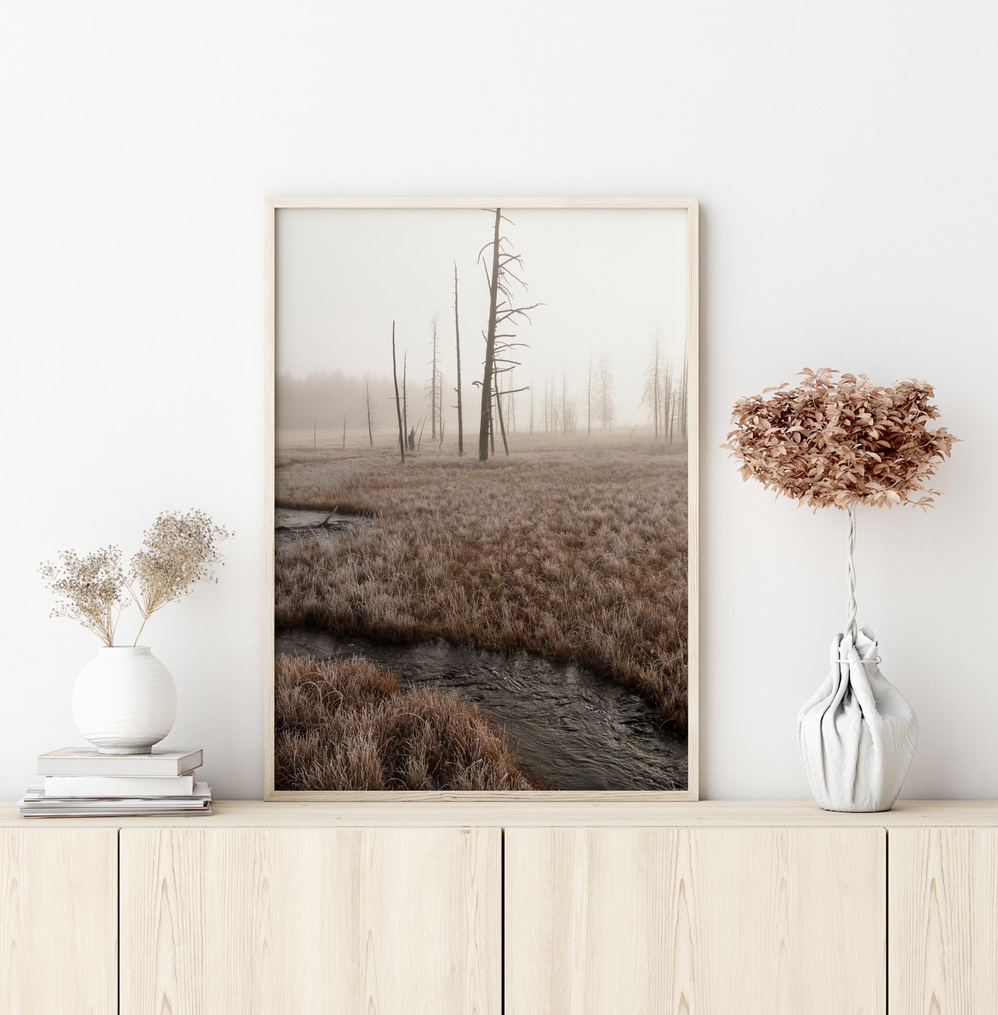 Eteerinen maisemajuliste tasangosta, jossa on kuolleita puita ja sen halki virtaa puro. Tässä varhain aamulla otetussa kuvassa sumu peittää puut ja keltaisen ruohon. Seuraa puroa, kun se kiemurtelee maiseman läpi kaukaisuuteen, kaukaiseen metsään. Eksy toiseen aikaan ja paikkaan, kun ripustat tämän.