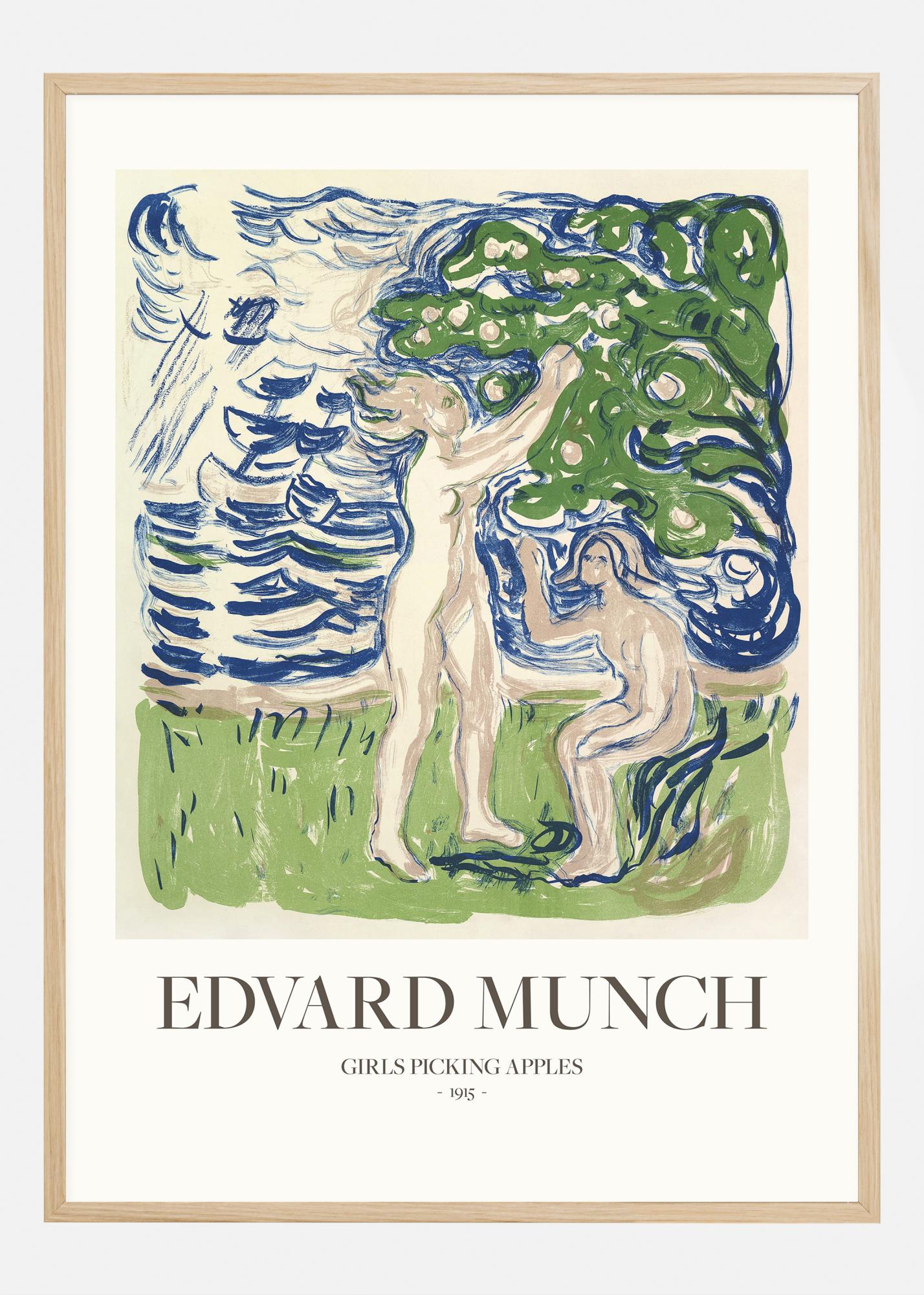 Tämä juliste kuvaa 'Girls Picking Apples', Edvard Munchin vuodelta 1915 peräisin olevaa teosta, joka vangitsee idyllisen ja tunnelmallisen kohtauksen. Teos tarjoaa yksinkertaisen mutta ilmaisuvoimaisen kuvauksen kahdesta hahmosta puiden keskellä, heidän kehonsa ja kasvonsa erottuen löysillä, vapailla siveltimenvedoilla. Väripalettia hallitsevat raikas vihreä ja maanläheinen ruskea, jotka muodostavat nurmikon ja puunrungot, kun taas sininen ja valkoinen taivas luovat elävän taustan, joka korostaa kirkkaita omenanvihreitä sävyjä ja pehmeitä ihonsävyjä. Tämä printti on ylistys elämän yksinkertaisille iloille ja tarjoaa taiteellisen säväyksen, joka tuo mihin tahansa huoneeseen luonnon ja vapauden tunteen.