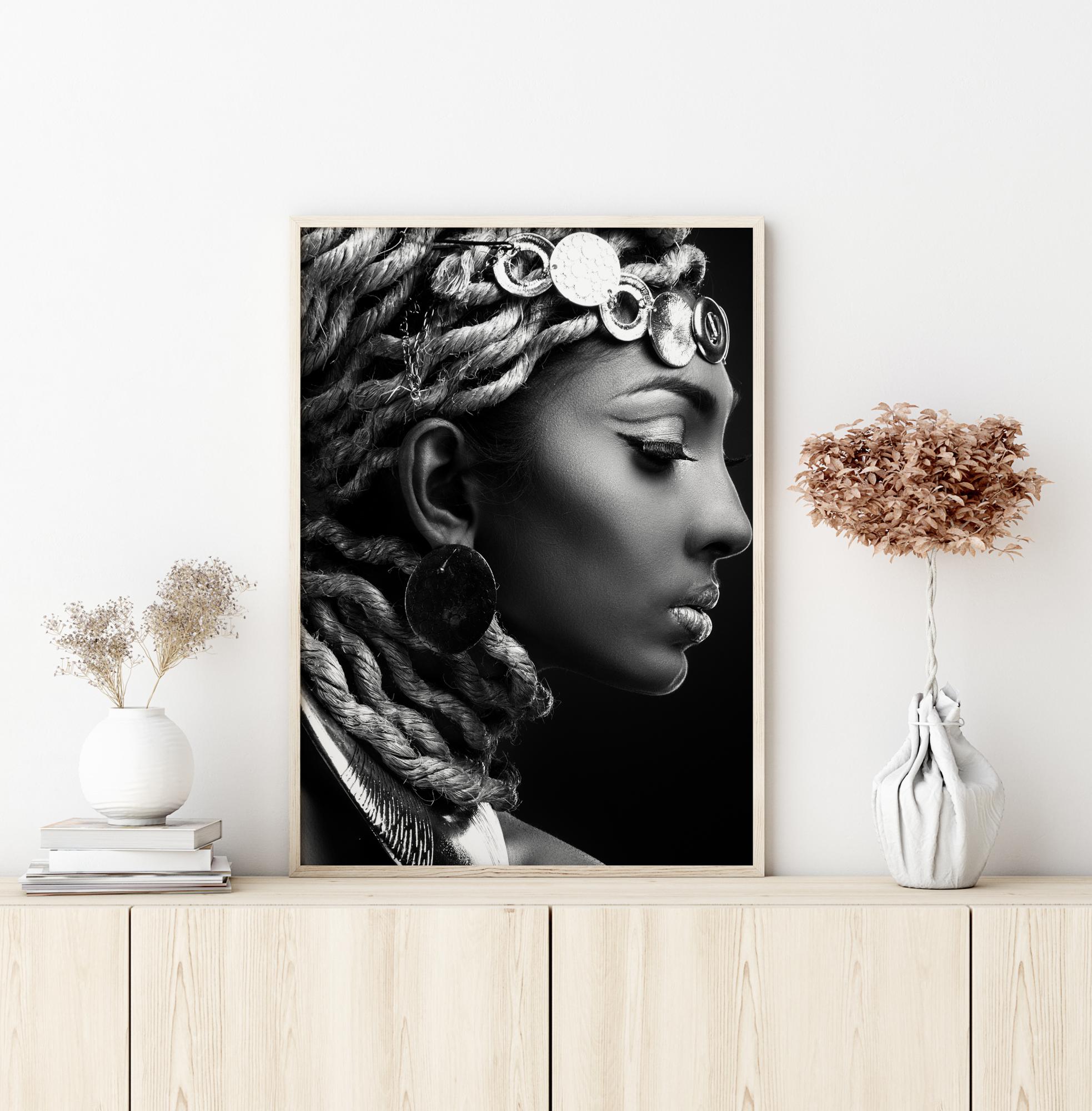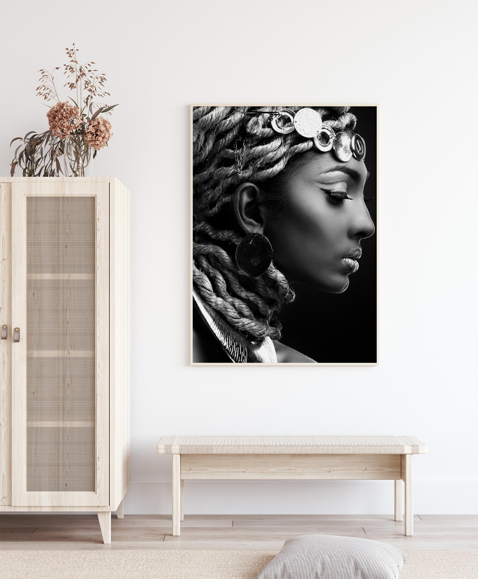 Upea muotokuvajuliste naisen profiilista, kun hän pukeutuu muinaisen Egyptin tyyliin. Tämä mustavalkoinen kuva luo draaman tunteen, kun tämä kaunis nainen katsoo vallattomasti alaspäin. Hänen päätään, korviaan ja kaulaansa peittävät suuret kultaiset korut, jotka ovat rikkauden symboli. Inspiroidu joka päivä tästä vahvasta naisesta.