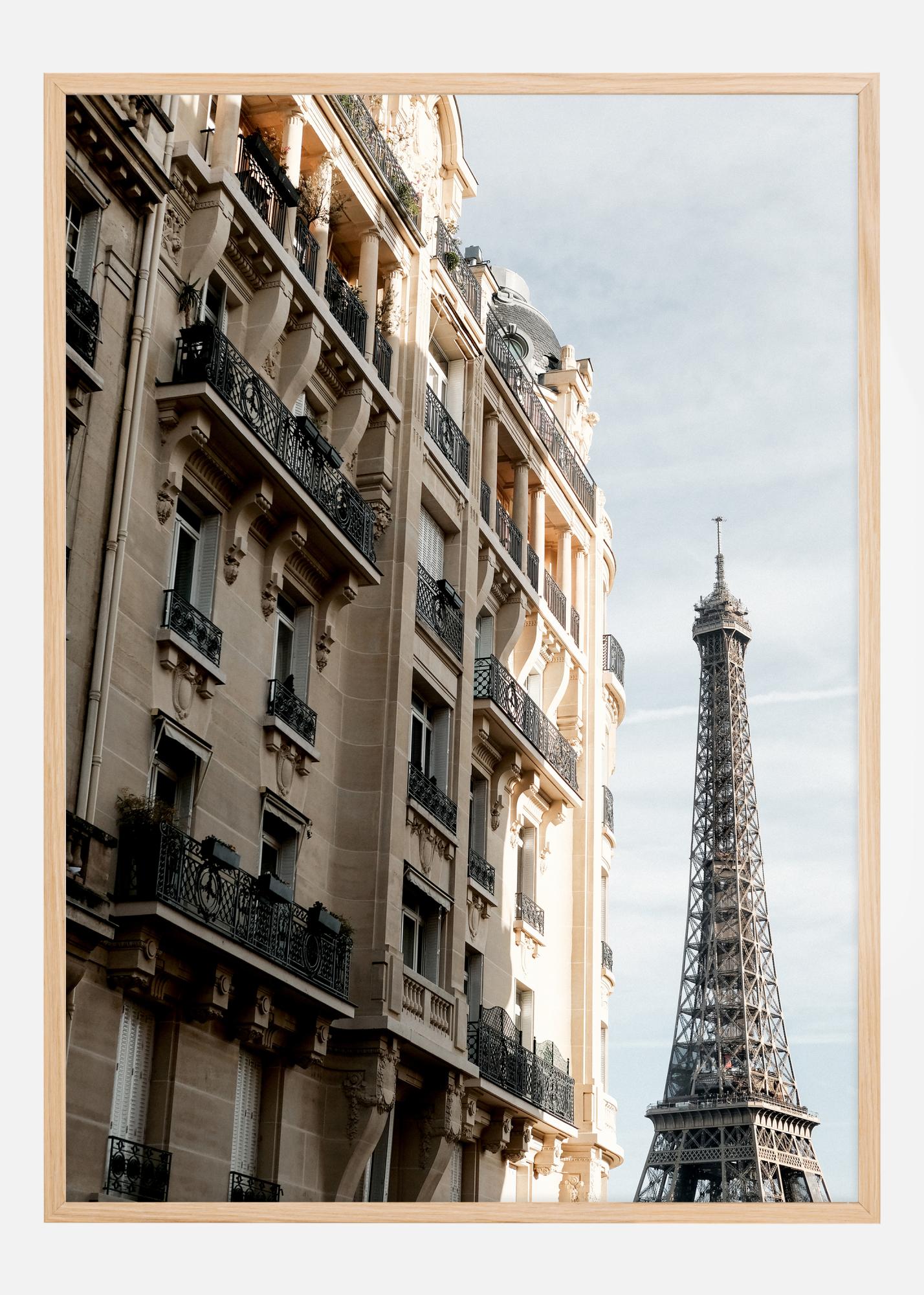 Tämä juliste kuvaa klassista näkymää Pariisista, jossa Eiffel-torni kohoaa ylpeästi kaupungin tyypillisten asuinrakennusten takana, joilla on takorautaiset parvekkeet ja veistokselliset julkisivuyksityiskohdat. Se on kohtaus, joka huokuu pariisilaista ilmapiiriä ja eleganssia, täydellinen tuomaan ripauksen ranskalaista tyyliä mihin tahansa kotiin. Kuva vangitsee täydellisen tasapainon kaupungin arkkitehtonisten helmien ja avoimen taivaan välillä, mikä antaa tunteen tilasta ja vapaudesta, joka on synonyymi Pariisin hengelle.