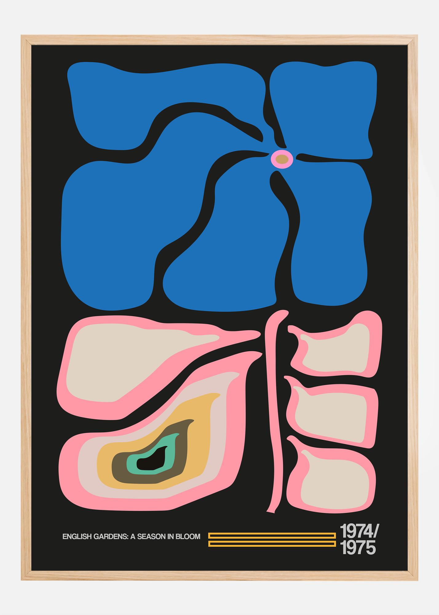 Tämä luova ja värikäs 'Englannin puutarhat: Kausi kukassa' -juliste on esteettinen kunnianosoitus puutarhakukinnan monimuotoisuudelle ja loistolle. Juliste kiinnittää huomion sen voimakkaalla, sinisellä kukalla, joka erottuu mustasta taustasta, ja jota täydentävät aksenttivärit vaaleanpunaisella, beigellä ja vihreän vivahteella. Tämä erityinen värikombinaatio tarjoaa rohkean ja nykyaikaisen tulkinnan klassisesta englantilaisesta puutarhasta täydessä kukassa. Vuosi '1974/1975' lisää historiallisen ulottuvuuden, joka saattaa viitata merkitykselliseen ajanjaksoon puutarhoille tai taiteelle.
