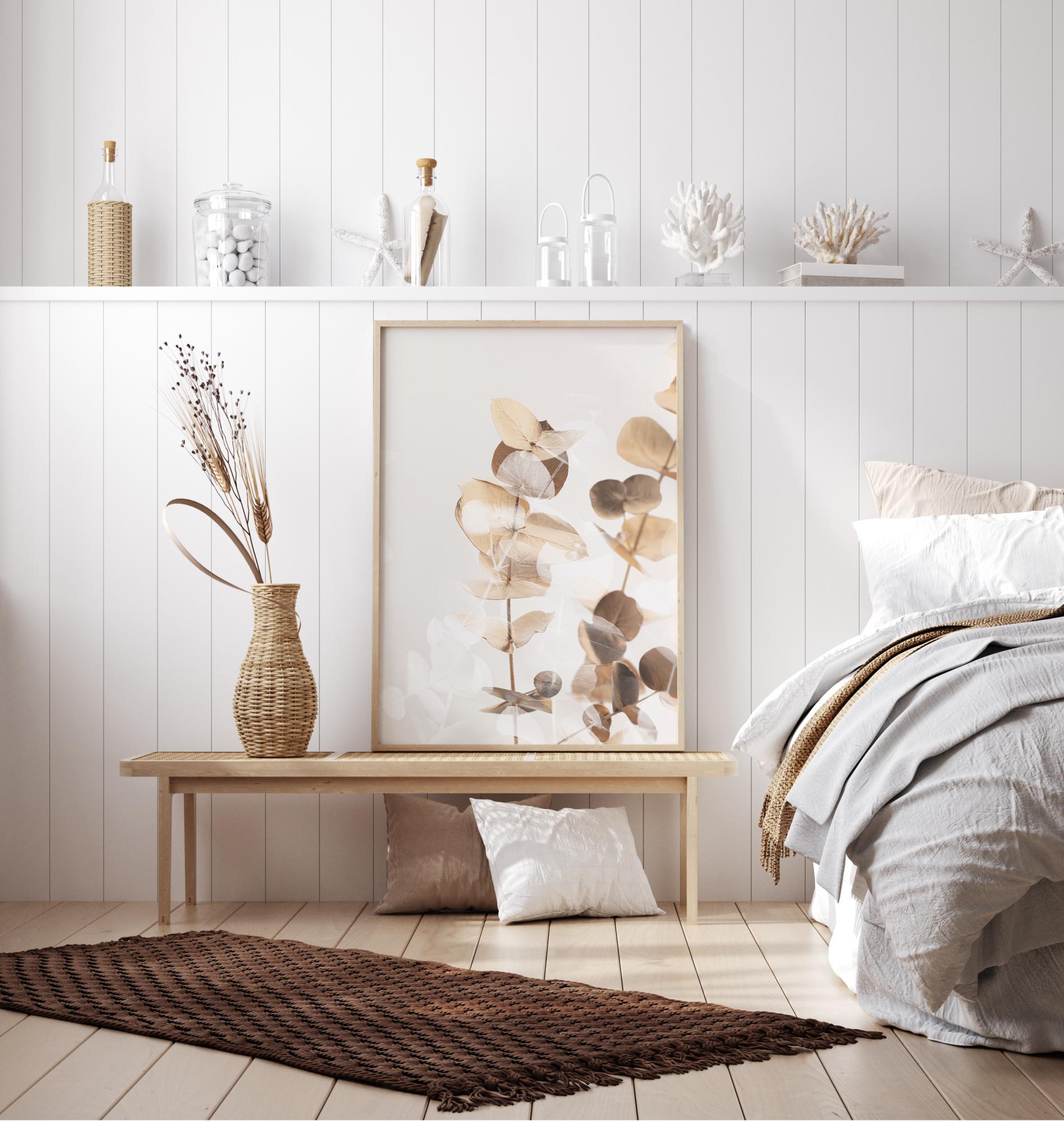 Kultainen juliste eukalyptuksen lehdistä ja oksista. Kultaiset ja ruskeat lehdet erottuvat hohtavina yksinkertaista valkoista taustaa vasten. Jos haluat tehdä näistä lehdistä rohkeampia, sovita samankaltainen kultainen tai tumman kermanvärinen seinä lisäämään tyylikkyyttä.