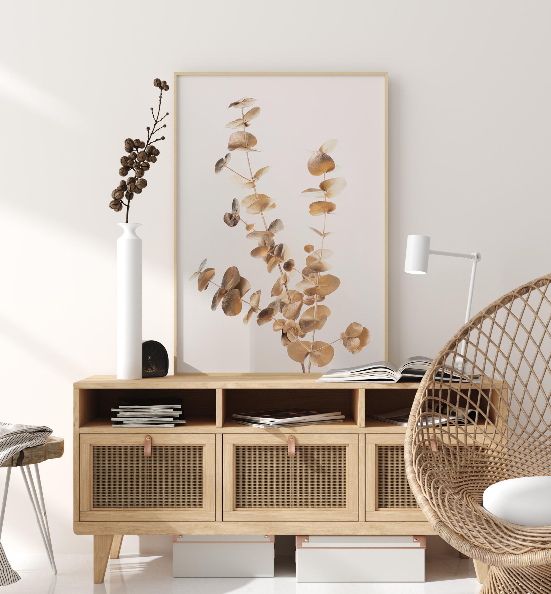 Yksinkertainen juliste useista kultaisista eukalyptuslehtien oksista. Kullan ja ruskean sävyt ovat rauhoittavia ja rentouttavia. Oksat ovat yksinkertaisella valkoisella pohjalla, jotta voimakas kulta erottuu ja luo dramaattisen mutta tyylikkään vaikutelman kotiisi.