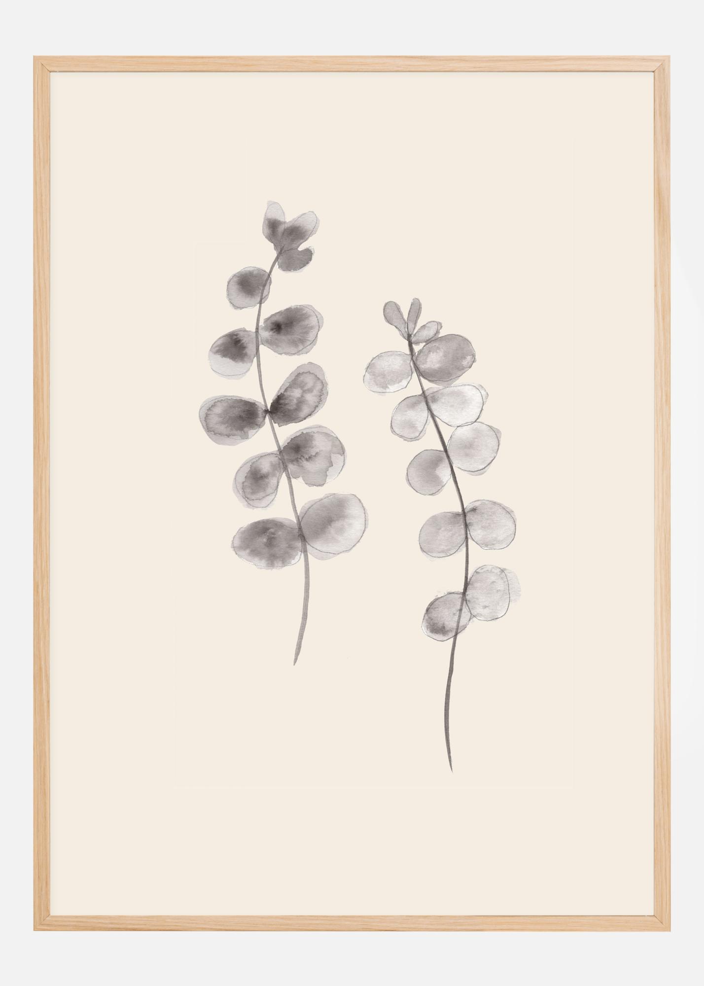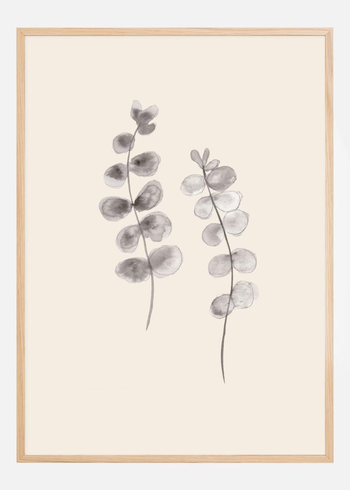 Kasvitieteellinen juliste kahdesta harmaasta eukalyptuksen lehdestä. Valkoisen taustan keskellä on kaksi harmaaksi maalattua oksaa, joissa on eukalyptuksen lehtiä. Ne aaltoilevat yhdessä luoden pehmeän kaaren, joka johtaa silmää ylöspäin julisteen läpi. Tuo tämä lehtitanssi kotiin rauhoittavan tunnelman luomiseksi.