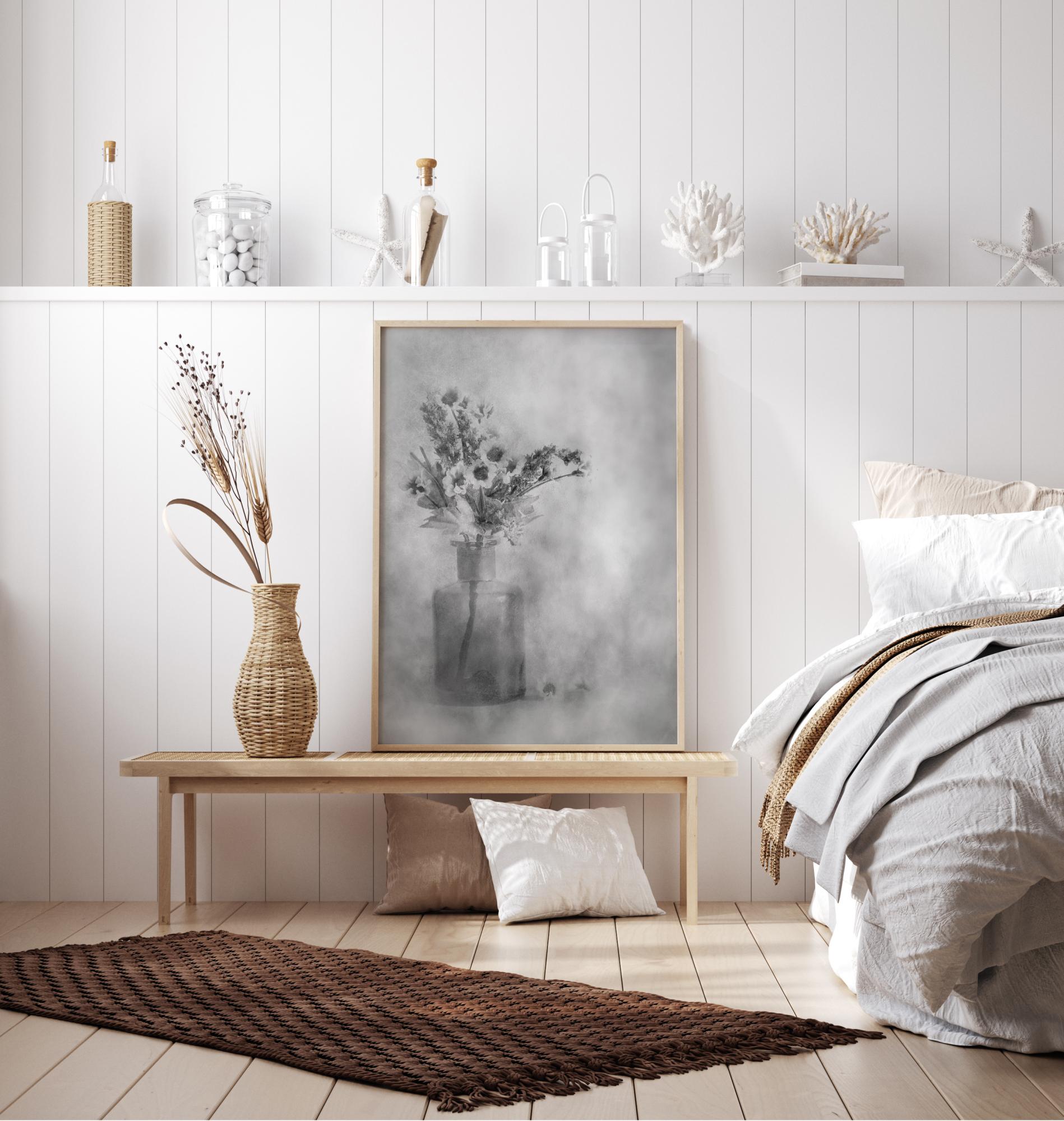 Romanttinen juliste pehmeästä asetelmasta, jossa on maljakko ja kukkia. Tässä harmaasävyisessä teoksessa on lempeän maalauksellinen tunnelma ja minimaalinen kontrasti kuvan eri elementtien välillä. Kuvittele itsesi asettumaan maalaamaan tätä rauhallista kohtausta, kun ripustat tämän pastelliväriselle seinälle kotonasi.