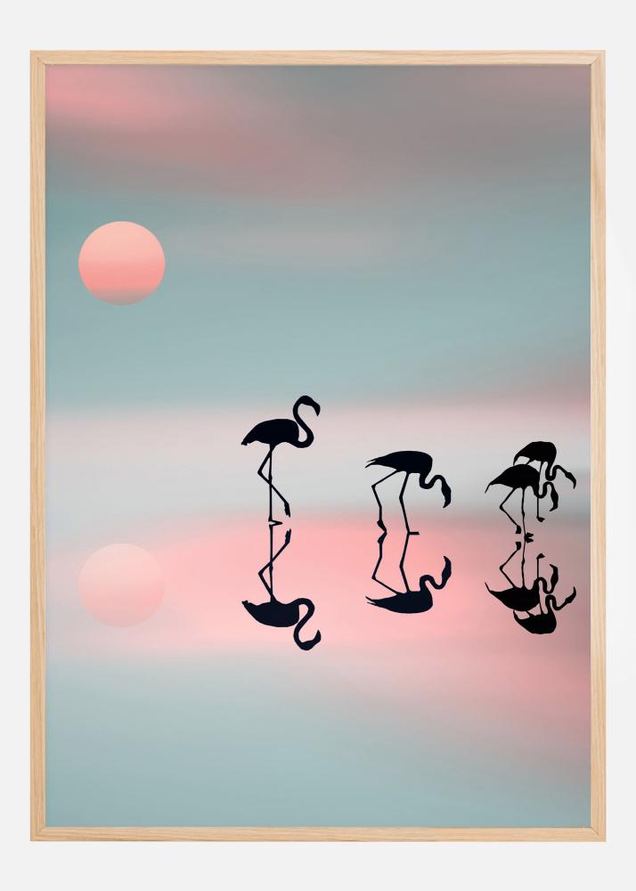 Eloisa juliste neljästä flamingosta, jotka ruokailevat vaalean pastellivärisellä järvellä. Sininen, vaaleanpunainen ja persikanvärinen valo luo pehmeän kuvan, kun tämän flamingoperheen siluetit ylittävät kevyesti järven. Voit melkein tuntea rauhan tässä pehmeässä, hienovaraisessa kuvassa.