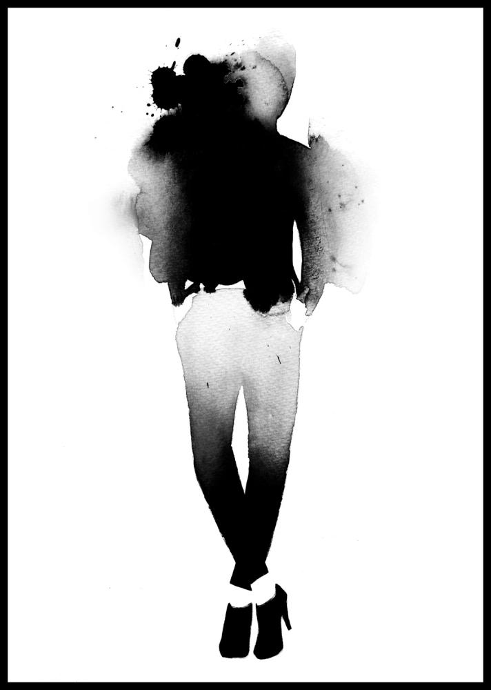 Juliste abstraktilla fashion-kuvalla, joka on saanut inspiraationsa muotimaailmasta. Kuvan alkuperäisversio on musta akvarellimaalaus, jossa on korostettu muotokuva. Graafinen painatus sopii hienosti valkoiseen kehykseen, joka ei kilpaile aiheen kanssa. Yhdistä muiden samantyylisten aiheiden kanssa hienoksi taulukollaasiksi.