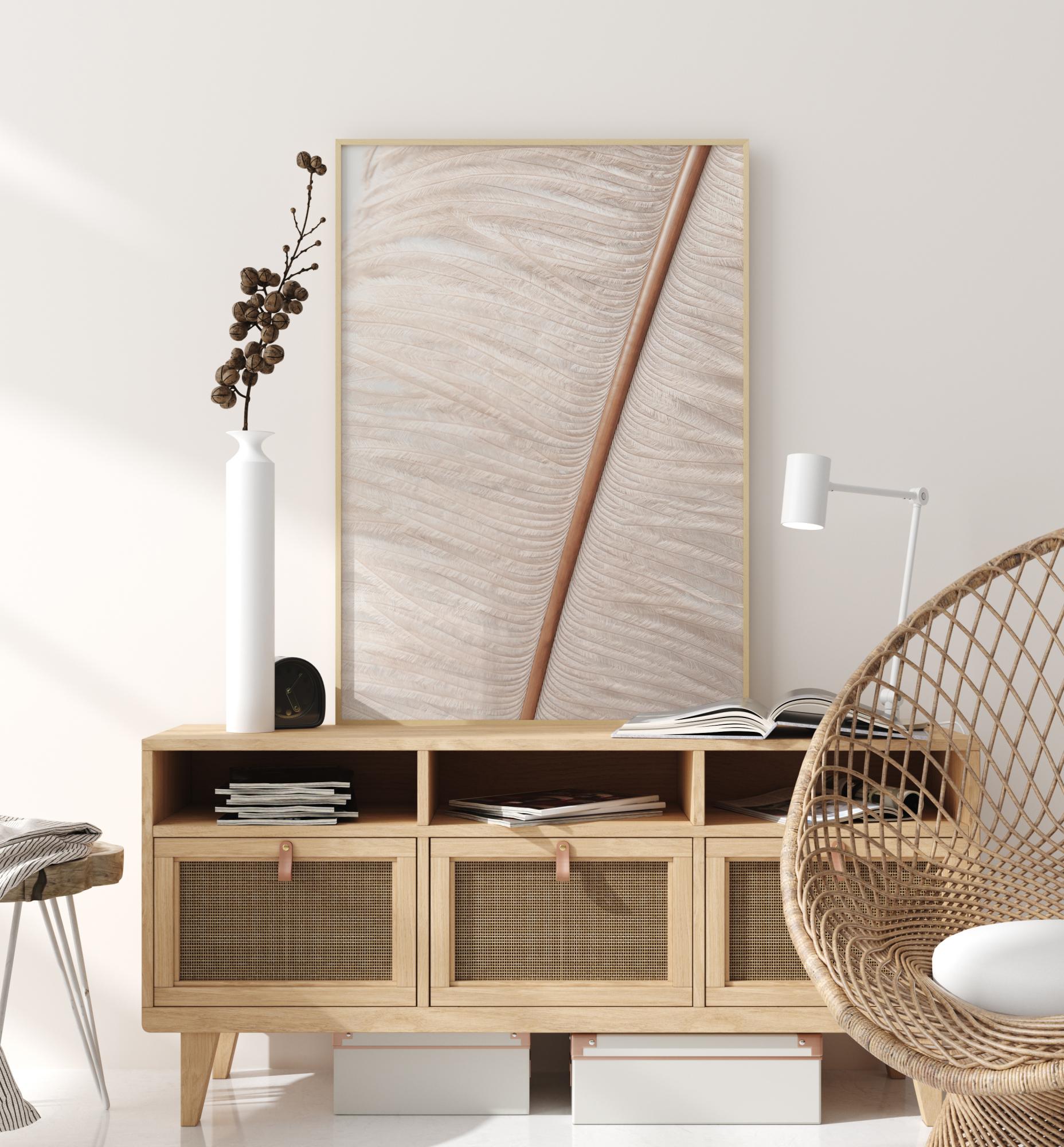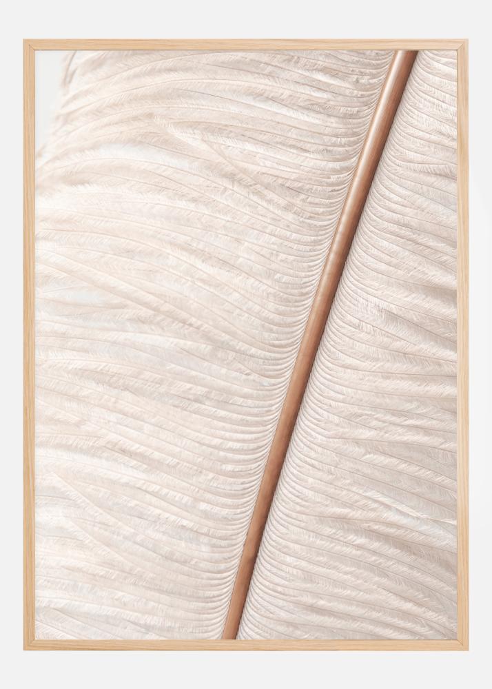 Makrojuliste strutsin höyhenen höydyistä. Tässä suurennetussa kuvassa näkyy vahva ruoti keskellä, josta haarautuvat kaikki pienet pörröiset valkoiset höydyt. Yksityiskohdat ovat hämmästyttäviä tässä pehmeässä, mutta vaikuttavassa julisteessa. Sopii neutraalin seinän kanssa pehmeän vaikutelman aikaansaamiseksi.