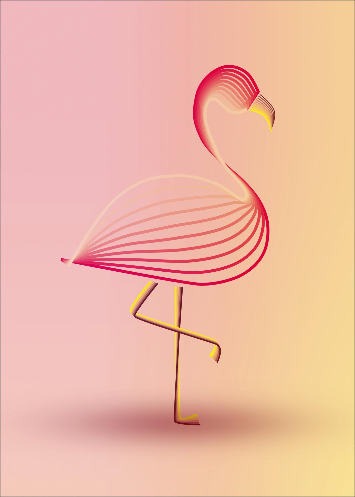 Abstrakti juliste hauskasta eloisasta vaaleanpunaisesta flamingosta. Flamingo koostuu erilaisista yksinkertaisista, kuumilta vaikuttavilta vaaleanpunaista ja keltaista viivoista. Se astelee korkealla vaaleanpunaisella taustalla. Söpön juhlallisen ilmeen saat, kun lisäät tämän valkoiselle seinälle ja annat värien loistaa.