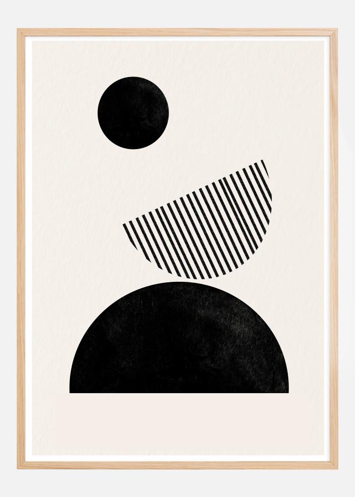 Tämä taiteellinen juliste tunnetaan leikkisästä geometristen muotojen ja tekstuurien käytöstään, jotka luovat tasapainoisen ja modernin kokonaisuuden. Suuri musta ympyrä on ylhäällä, jota seuraa vinottain uurrettu puolipyöreä muoto ja kiinteä musta puolikaaren muotoinen muoto alareunassa. Jokainen elementti lisää liikkeen ja dynamiikan tunnetta, samalla kun yhtenäinen värimaailma luo tunteen yhtenäisyydestä ja yksinkertaisuudesta.