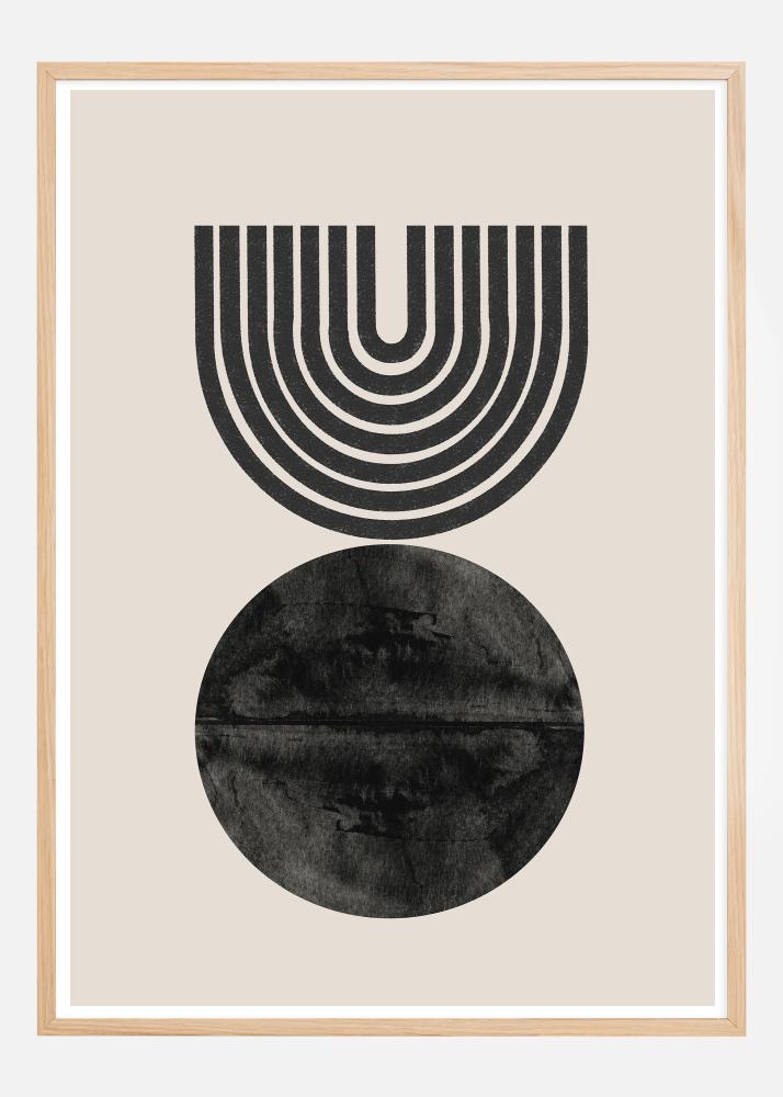 Tämä taiteellinen juliste vangitsee katseen rohkealla kontrastillaan ja kiehtovalla koostumuksellaan, jossa yhdistyvät geometriset ja orgaaniset muodot. Yläosassa esiintyy joukko mustia viivoja, jotka luovat puoliympyrän muodon, antaen voimakkaan visuaalisen rakenteen rauhallista, neutraalia taustaa vasten. Alapuolella näemme teksturoidun mustan ympyrän, joka muistuttaa veden heijastuksia, tuoden syvyyttä ja salaperäisen laadun suunnitteluun. Mustan ja luonnonvalkoisen valitut värit luovat ajattoman paletin, joka houkuttelee monenlaisia makuja ja sisustustyylejä.
