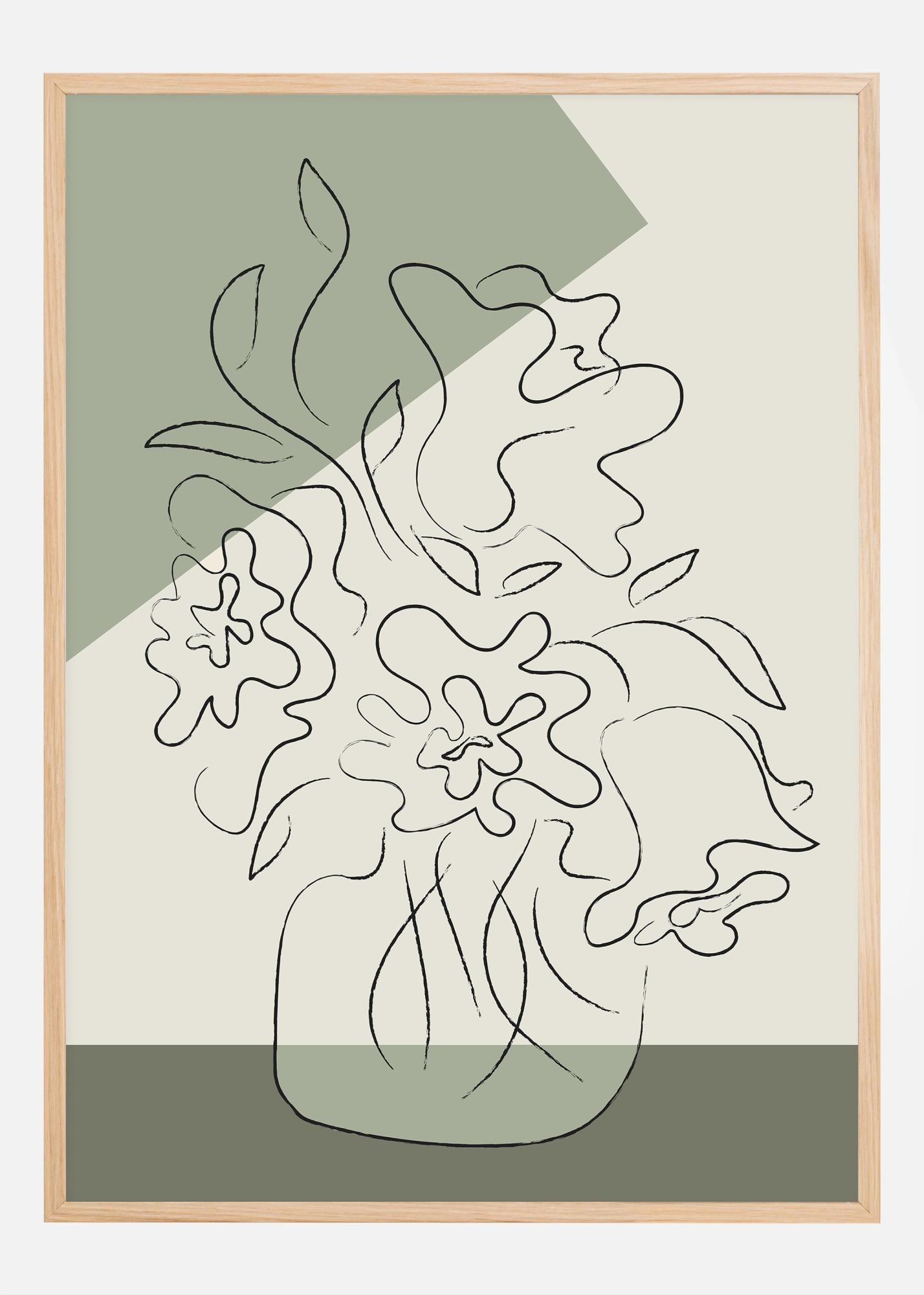 Tämä taiteellisen abstrakti juliste kuvaa tyyliteltyjä terälehtiä ja lehvistöä elegantissa, virtaavassa piirrosviivassa, jotka leijuvat yli kaksivärisen taustan pehmeissä vihreissä ja neutraaleissa sävyissä. Designin yksinkertainen kauneus, jota vahvistaa hienovarainen tekstuuri, joka antaa orgaanisen tunteen, luo rentouttavan ja rauhallisen ilmapiirin. Tämä moderni ja tyylikäs printti sulautuisi täydellisesti minimalistiseen tai skandinaavisesti inspiroituun kotiin, lisäten luonnon rauhallisuuden häivähdyksen ilman, että se veisi huomiota liiallisella värillä tai monimutkaisuudella.
