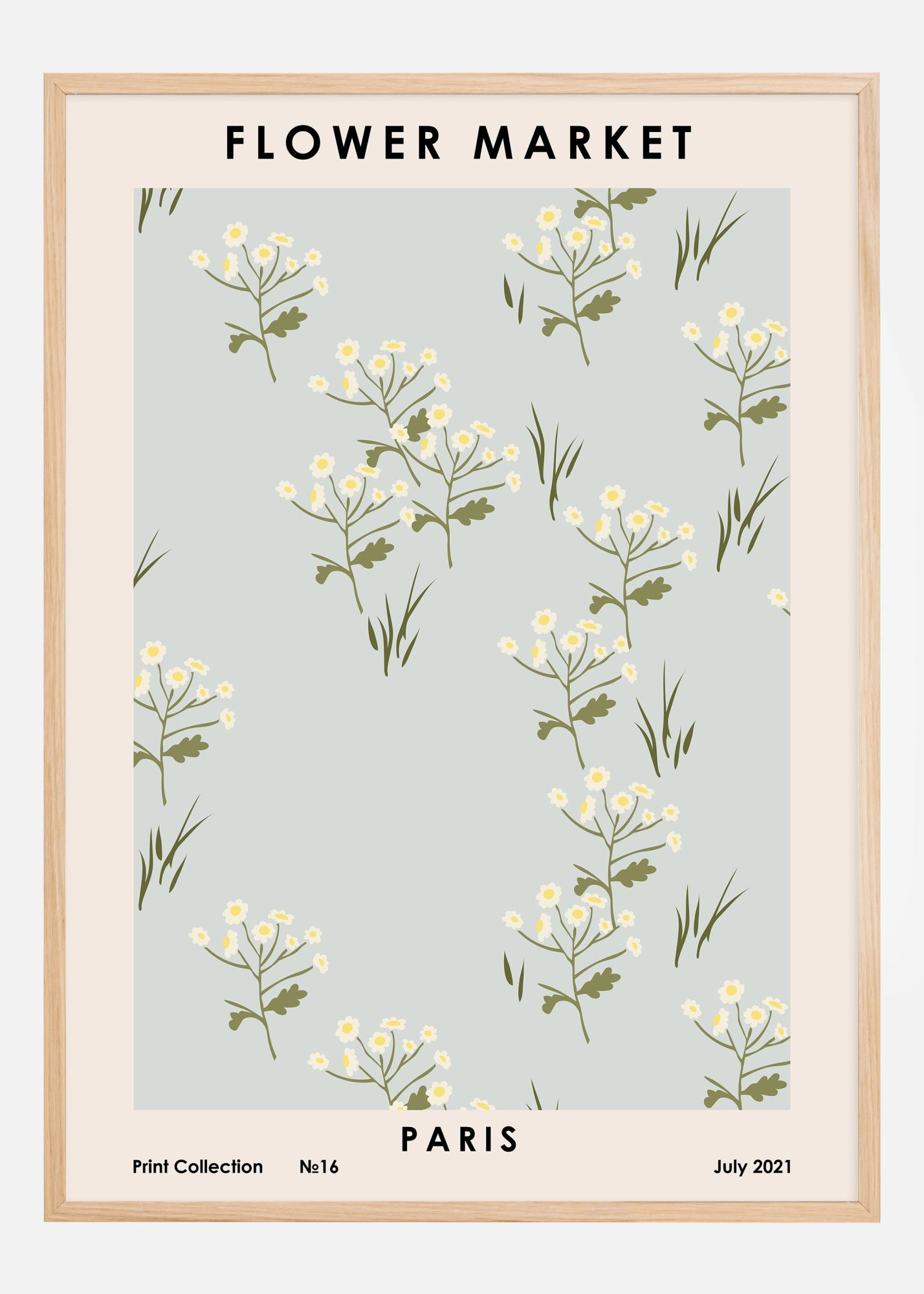 Tämä viehättävä ja tyylikäs juliste vie sinut suoraan Pariisin sydämeen kuvallaan kukkamarkkinoista. Se esittelee herkkiä valkoisia kukkia rauhoittavaa harmaan sinistä taustaa vasten, mikä luo raikkauden ja yksinkertaisen eleganssin tunteen. Yläreunassa lukee teksti "FLOWER MARKET" klassisella typografialla, kun alaosa sisältää tekstin "Print Collection ?16 PARIS July 2021", mikä lisää aitouden ja kulttuurisen kontekstin tunteen.