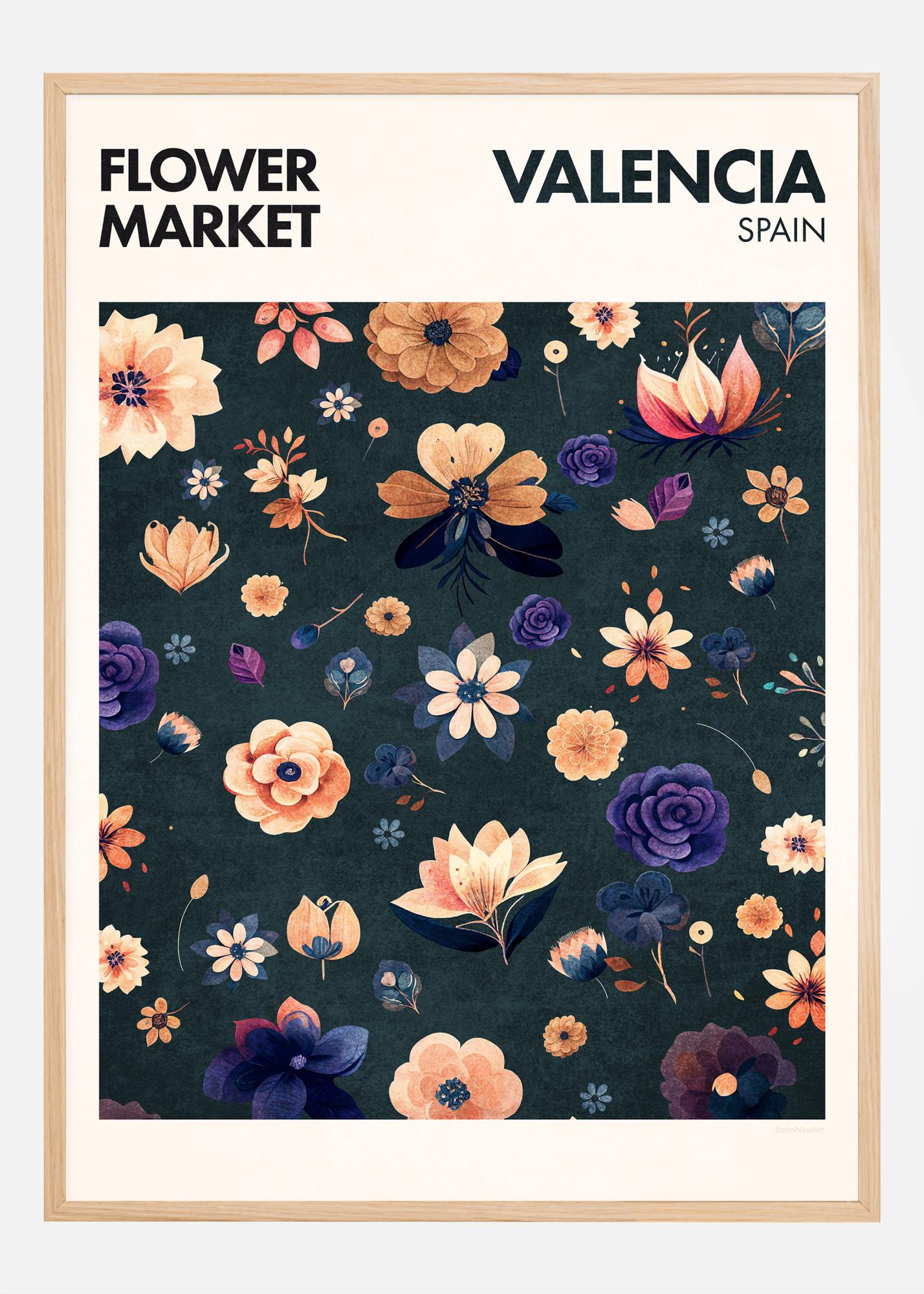 Tämä värikäs ja elävä juliste esittää Valencian kukkamarkkinoiden kukkaloiston Espanjassa. Yksityiskohtainen aihe on kunnianosoitus markkinoiden monimuotoiselle kukkatarjonnalle, jossa jokainen laji ja väri vaikuttaa kuin se olisi tallennettu täydessä kukassa. Hienovaraisista pastelliväreistä rohkeisiin, kylläisiin väreihin, suunnittelu vangitsee tunteen vehreästä keitaasta keskellä kaupungin sydäntä.