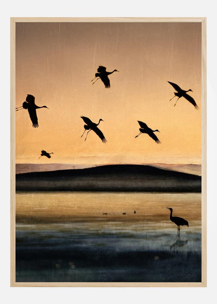 Tunnelmallinen juliste auringonlaskun aikaan lentävistä linnuista. Kuusi haikaraa lähtee lentoon, niiden siluetit erottuvat rohkeasti oranssia taivasta ja laskevaa aurinkoa vasten. Yksinäinen lintu seisoo sinikultaisessa järvessä ja katselee muita lintuja, kun ne lentävät pois. Tunne lennon rauha tässä lämpimässä julisteessa.