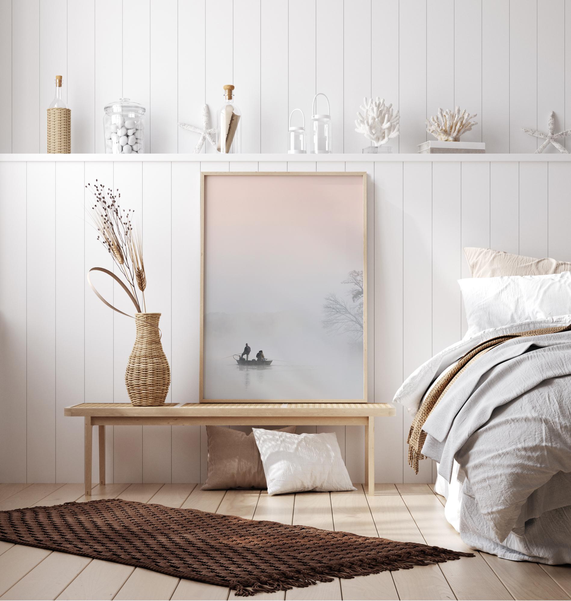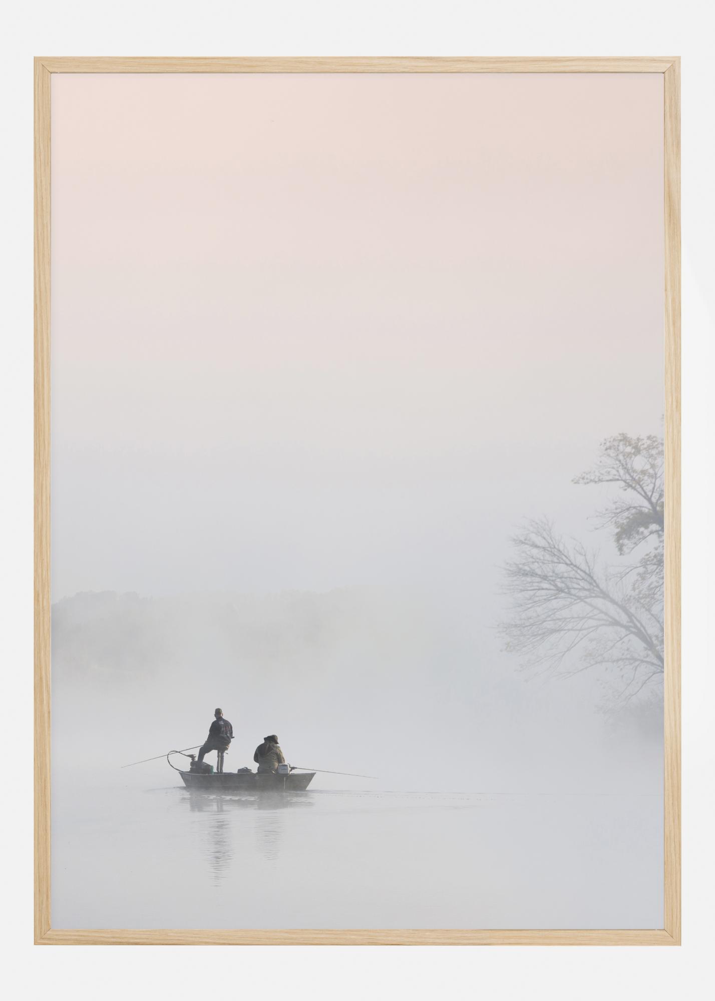 Maaginen juliste kahdesta miehestä, jotka kalastavat veneessä sumuisena aamuna. Pieni vene on vasemmalla siluettina. Oikealla näkyy puiden oksia, mutta kaikki on peittynyt voimakkaaseen valkoiseen sumupeitteeseen, mikä tekee tästä kuvasta maagisemman. Nauti varhaisen aamun rauhasta tämän julisteen avulla.