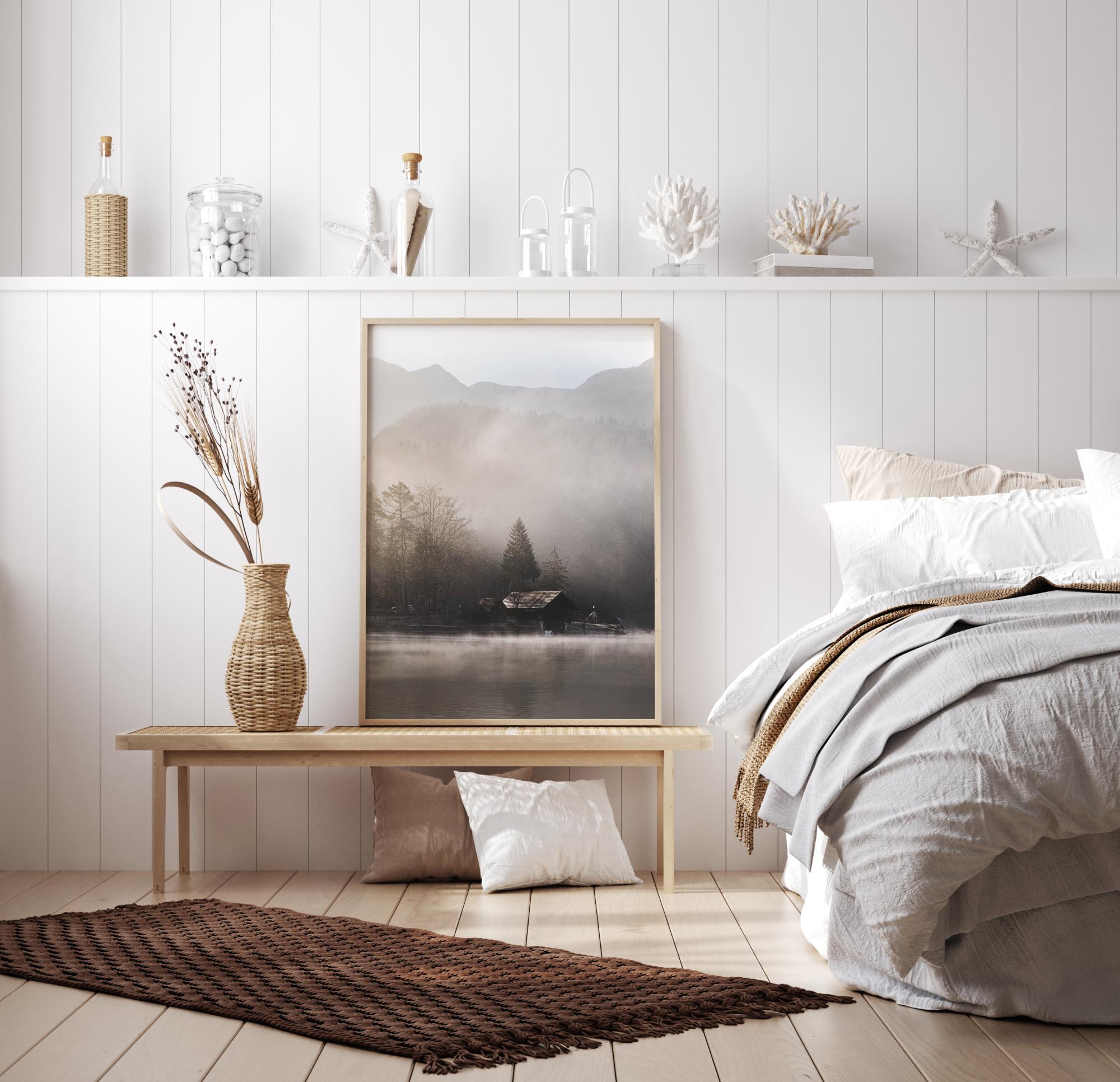 Pehmeä juliste vuoristossa sijaitsevasta mökistä, joka on sumuisen järven reunalla. Pehmeät pastellivärit antavat tälle kuvalle lempeän tunnelman, kun varhaisen aamun aurinko säteilee oikealta alas ja häivyttää sumun pois. Lisää tämä tavalliselle seinälle ja eksy tämän tunnelmallisen julisteen yksinäiseen erämaisuuteen ja yksinkertaisuuteen.