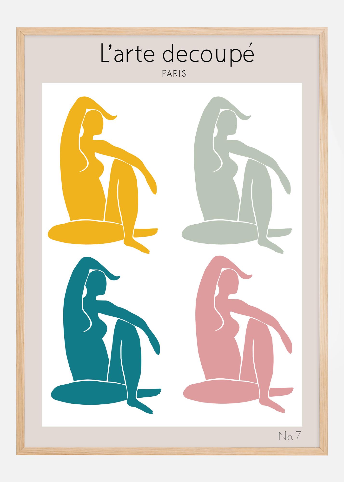 Tämä värikäs ja moderni juliste sarjasta 'L'arte découpé' esittelee neljä tyyliteltyä hahmoa dynaamisessa ja harmonisessa sommitelmassa. Jokainen hahmo on huolellisesti toteutettu erottuvassa värissä - auringon keltainen, taivaan sininen, pehmeä vihreä ja lämmin vaaleanpunainen - ja ne on asetettu harmaalle taustalle, joka antaa rauhallisen ja tasapainoisen ilmeen. Tämä taiteellinen vedos juhlistaa ihmishahmon monimuotoisuutta ja liikettä abstraktin ja yksinkertaistetun suunnittelunsa kautta, luoden voimakkaan visuaalisen ilmeen, joka sopii hyvin moderniin sisustustyyliin.