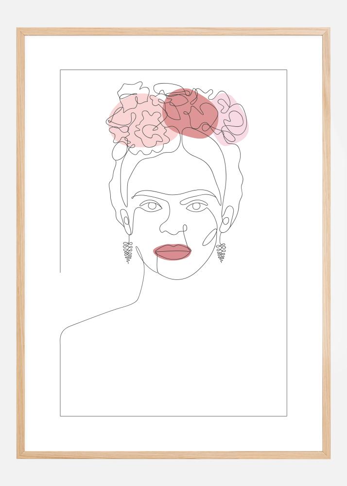 Abstrakti muotokuvajuliste Frida Kahlosta, jolla on kukkia hiuksissaan. Yksinkertainen viivapiirros Fridasta vangitsee välittömästi hänen olemuksensa, kun hän tuijottaa rohkeasti ulos maalauksesta. Ainoat väriläiskät ovat hänen huulensa ja hänen hiuksissaan oleva kukkapäähine. Sovita nämä värit yhteen seinällä, jolle ripustat hänet.