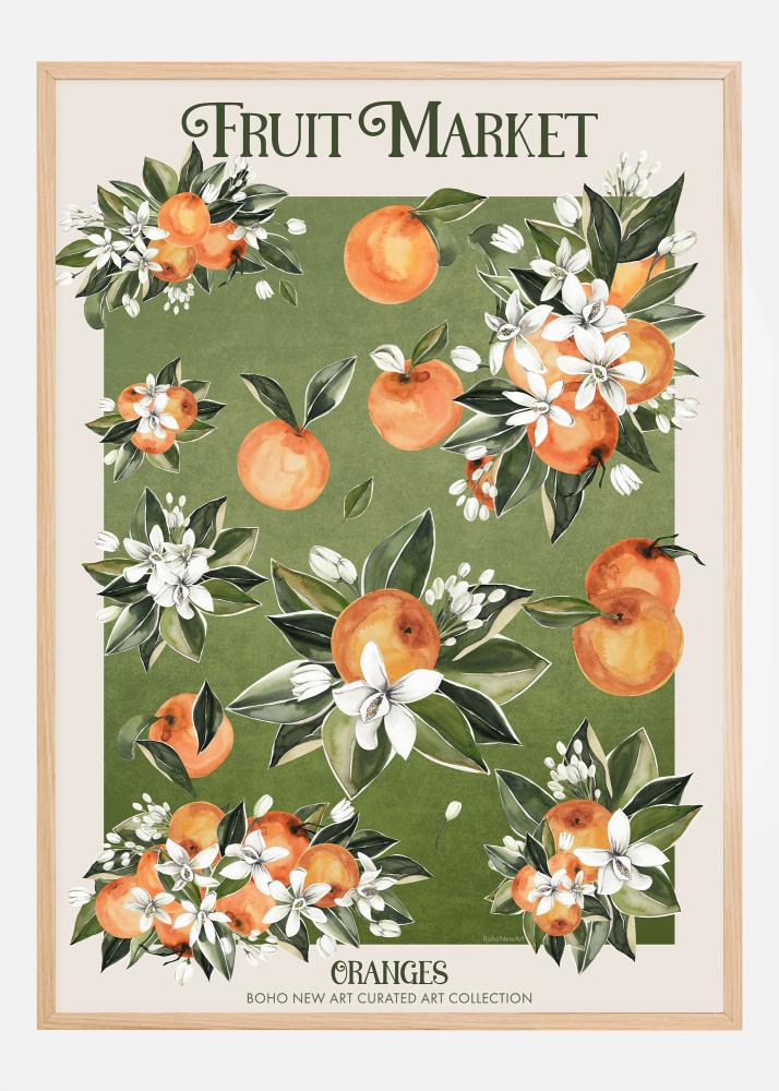 Tausta syvällä oliivinvihreällä värillä täydentää hedelmien eläviä oransseja sävyjä ja kukkien terälehtien pehmeitä valkoisia, antaen suunnittelulle tunteen raikkaudesta ja luonnollisuudesta. Juliste kuuluu 'Boho New Art Curated Art Collection' -kokoelmaan ja on tyylikäs sisustuselementti, joka sopii täydellisesti keittiöön tai ruokasaliin, jossa se voi inspiroida kulinaarisiin seikkailuihin tai vain tuoda kesän tunteen ympäri vuoden.