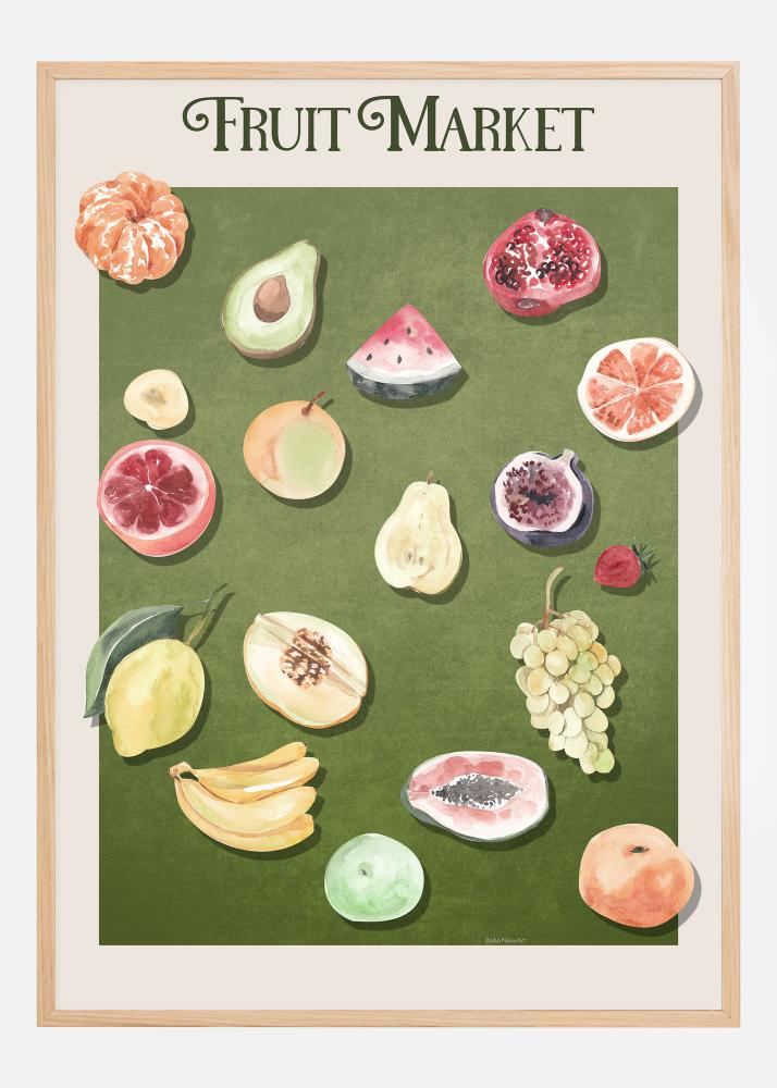Tämä värikäs juliste vangitsee vilkkaan hedelmätorin olemuksen ja on upea lisäys kokoelmaamme sisustustaiteen alalla. Painatus on silmän iloa, sillä siinä esitetään mehukkaita hedelmiä rikkaalla vihreällä taustalla, mikä luo tunteen tuoreudesta ja runsaudesta. Aurinkokypsistä sitruksista trooppisiin avokadon ja granaattiomenan vivahteisiin, tämä teos tarjoaa visuaalisen juhlan, joka sekä inspiroi että rikastuttaa. Jokainen hedelmä on kuvattu yksityiskohtaisesti, mikä korostaa niiden ainutlaatuisia tekstuureja ja muotoja, tehden tästä julisteesta pakollisen hankinnan kaikille, jotka arvostavat luonnonmukaista taidetta.