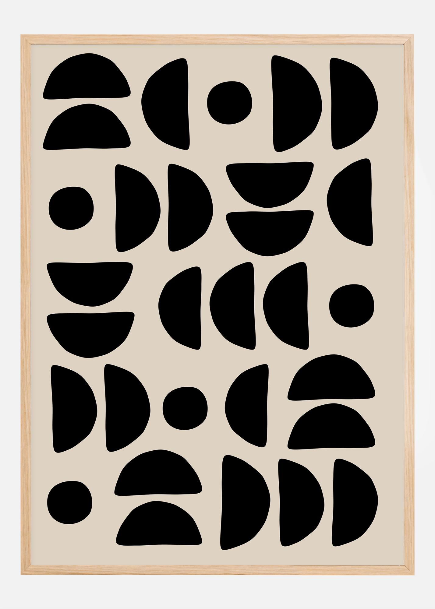 Tämä taiteellisesti luotu juliste erottuu rohkealla kuvioinnillaan mustista geometrisista muodoista beigeä taustaa vasten. Abstrakti muotoilu on leikkisä ja rytminen, luoden visuaalista jännitettä, joka on sekä modernia että ajaton. Tämä teos voidaan nähdä kunnianosoituksena sekä orgaaniselle maailmalle että graafisen suunnittelun konstruoiduille elementeille, ja se sopii täydellisesti niille, jotka arvostavat taidetta voimakkailla, puhtailla linjoilla ja voimakkailla kontrasteilla.