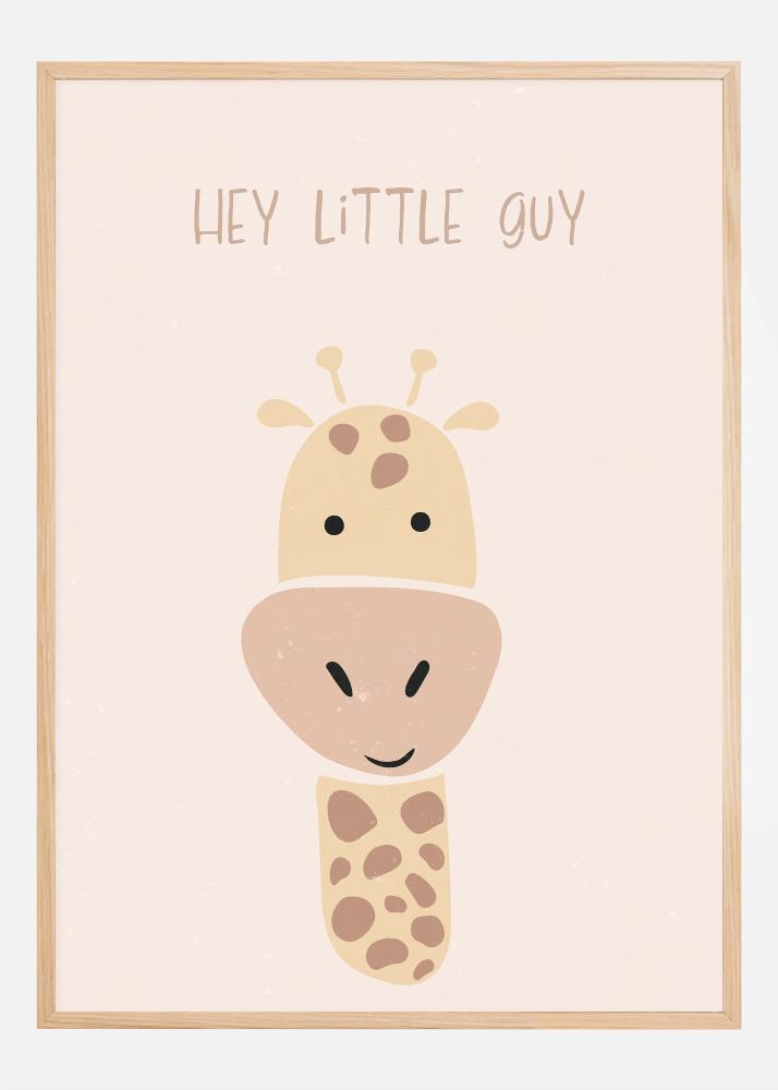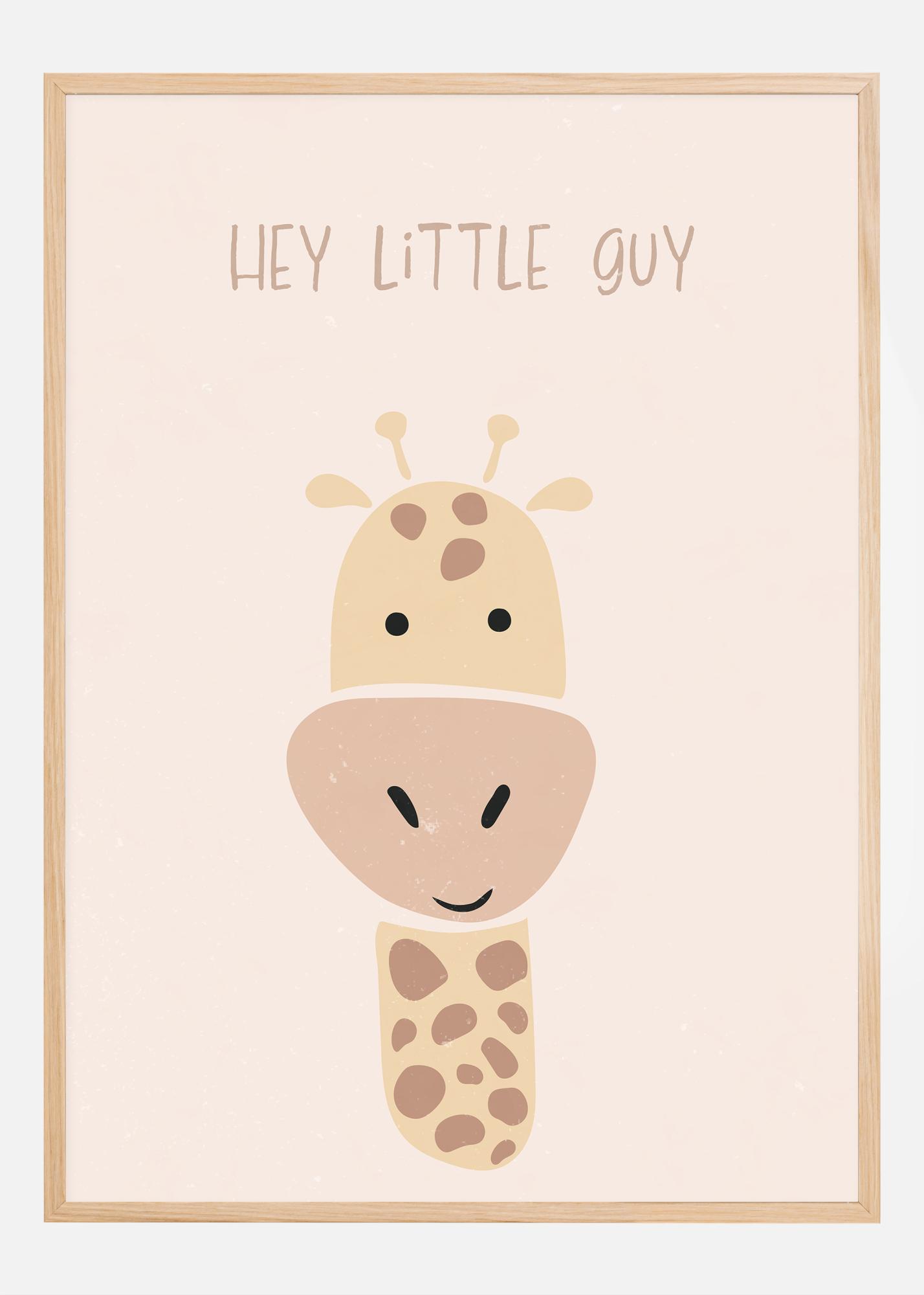 Tämä hurmaava juliste, jossa on teksti "HEY LITTLE GUY" ja kirahvinvasan kuva, on täydellinen seinäkoriste lastenhuoneeseen tai leikkisä yksityiskohta toiseen valoiseen huoneeseen. Aiheelle on ominaista pehmeät värit, kuten vaalea vaaleanpunainen taustalla ja lämpimät beige- ja ruskeansävyt kirahvin piirroksessa. Piirretty kirahvi, yksinkertaisella ja lapsiystävällisellä suunnittelullaan, kantaa suurta hymyä ja ystävällisiä silmiä, mikä luo välittömän yhteyden ja edistää iloista ja tervetullutta ilmapiiriä.
