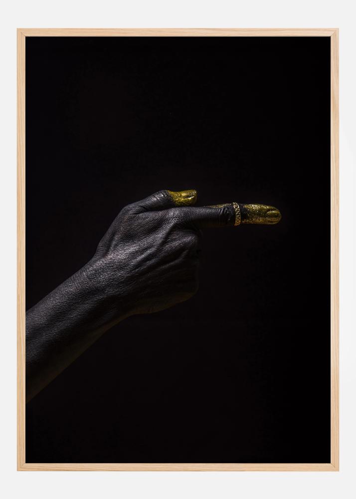 Taiteellinen juliste kädestä, joka osoittaa sormella kuin ase. Suurin osa kädestä on maalattu mustaksi, mutta sormet on maalattu kullanvärisiksi ensimmäiseen rystyselle asti. Käsi osoittaa kuin ase oikealle, mutta erottuu mustaa taustaa vasten. Lisää tämä kermanväriselle seinälle, niin saat todella dramaattisen ilmeen.
