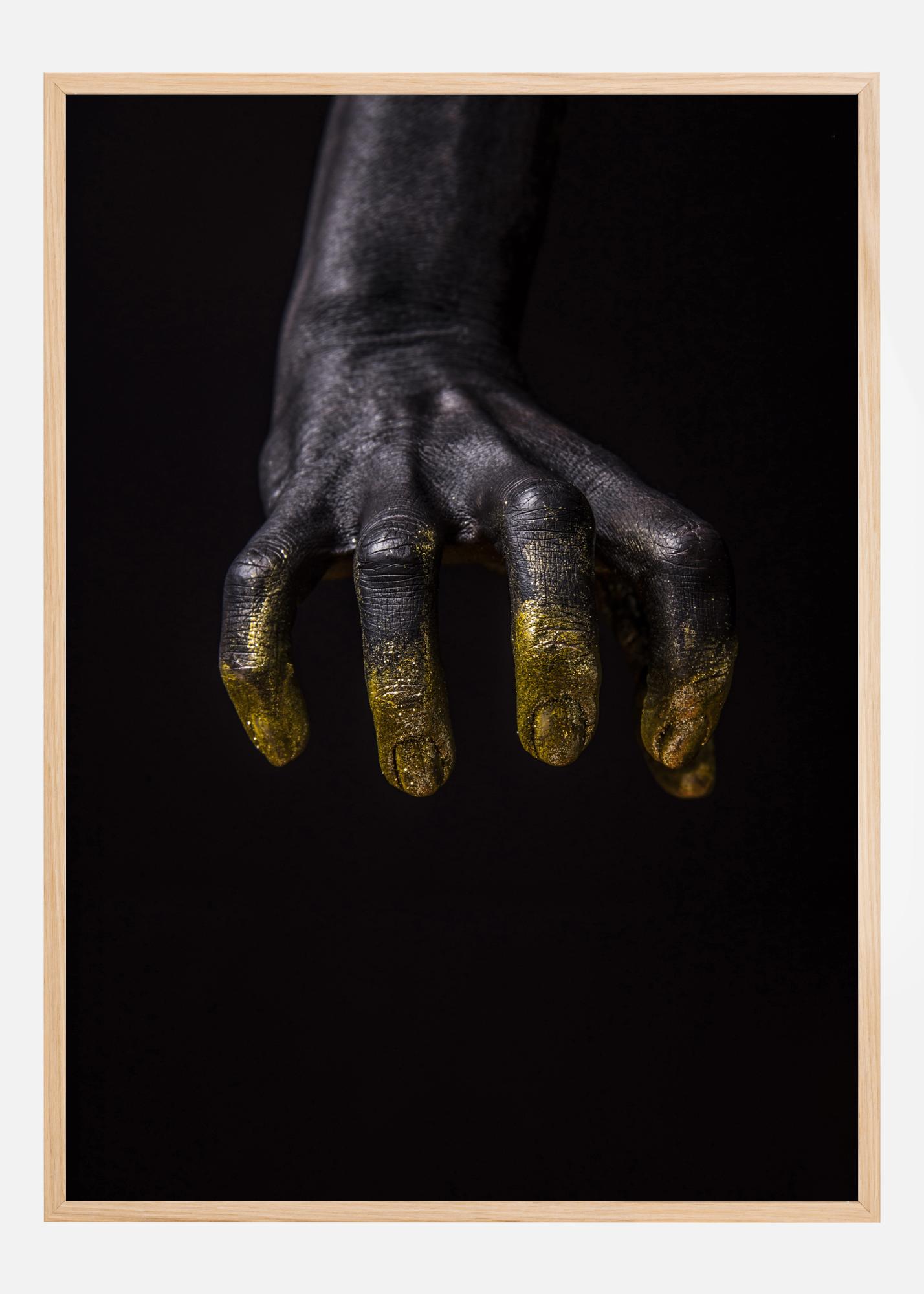 Dramaattinen juliste, jossa kynnelle kykenevä käsi kurkottaa alaspäin. Musta käsi tulee kuvan yläreunasta, sormet ovat taipuneet valmiina tarttumaan johonkin. Sormenpäät on peitetty kimaltavalla kullalla, mikä antaa erottuvan ilmeen. Lisää tämä eeppinen printti kotiisi.