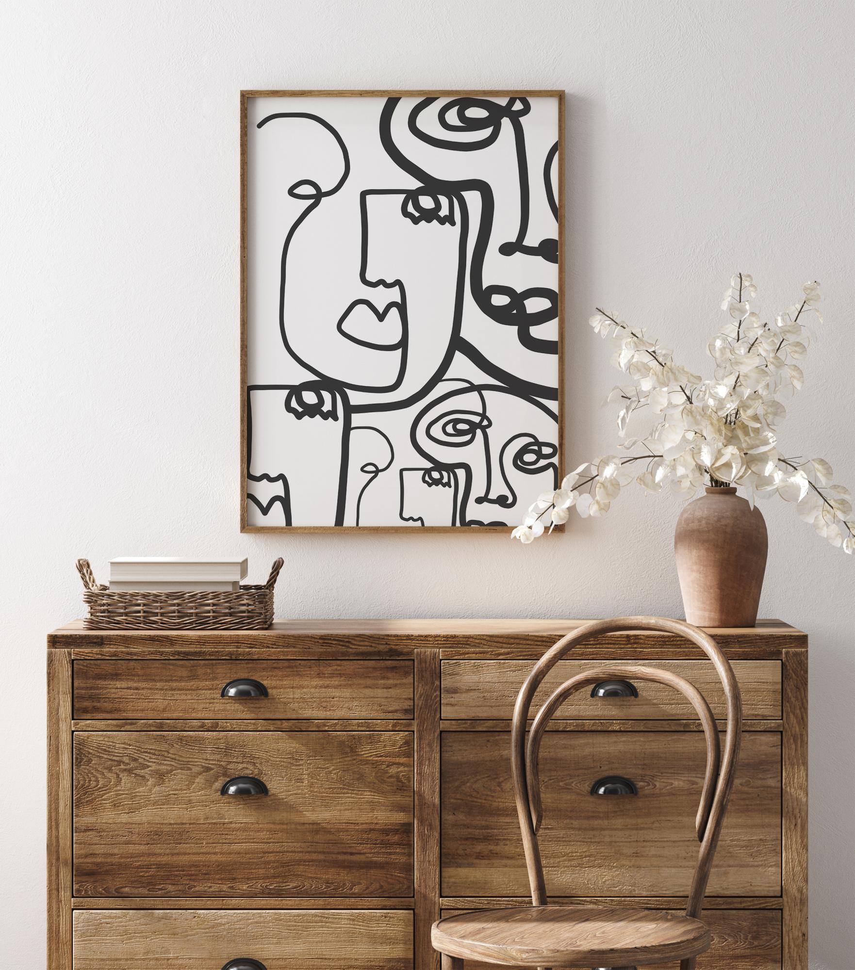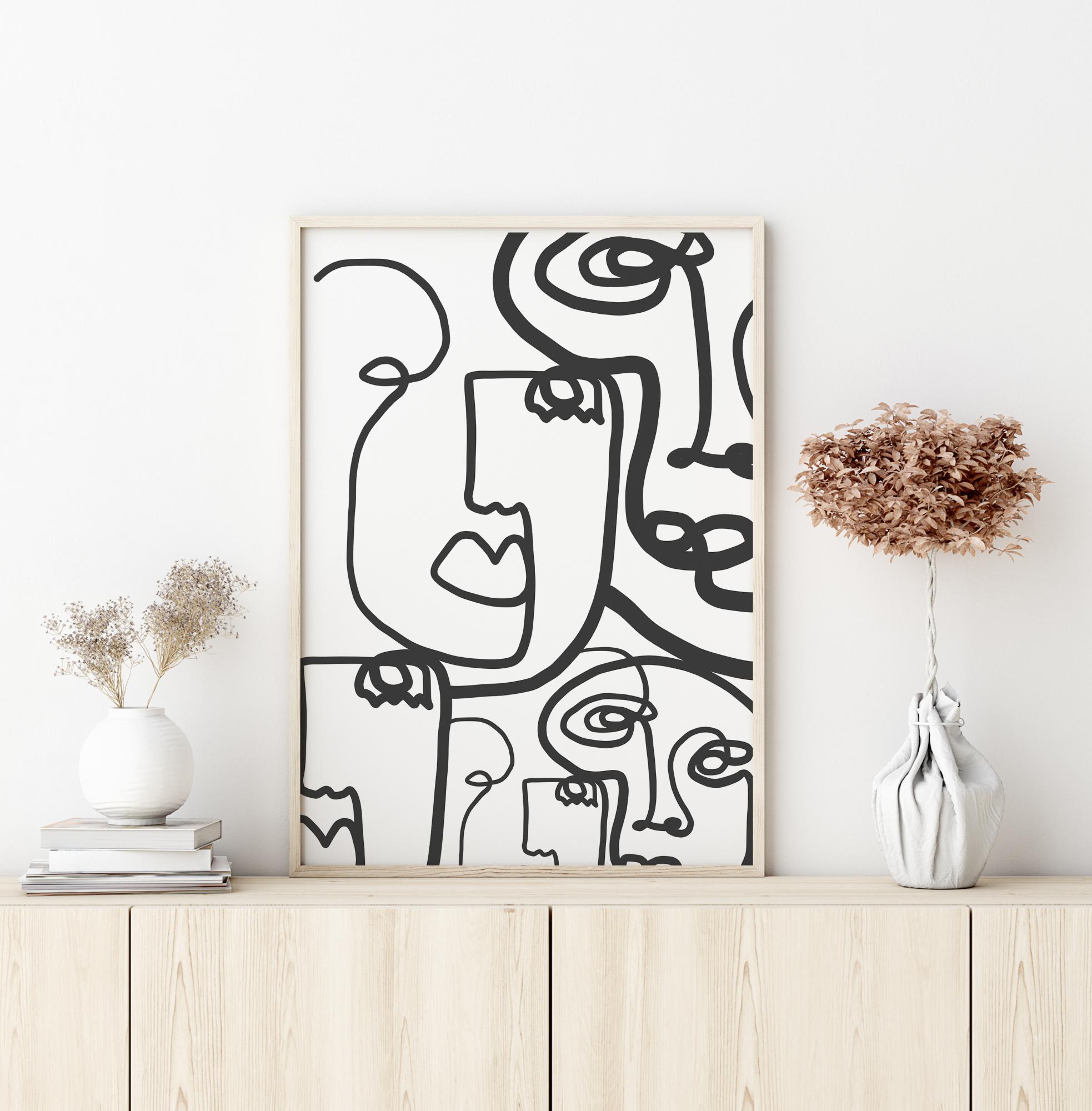 Dramaattinen abstrakti juliste, jossa on paljon viivalla piirrettyjä kasvoja. Paksut ja ohuet mustat viivat täyttävät tämän kuvan luoden viisi erillistä kasvoa. Viivat pyörivät valkoisen taustan läpi, joten sinun on keskityttävä, jotta löydät ne kaikki tähän kiireiseen kuvaan piilotetut kasvot.