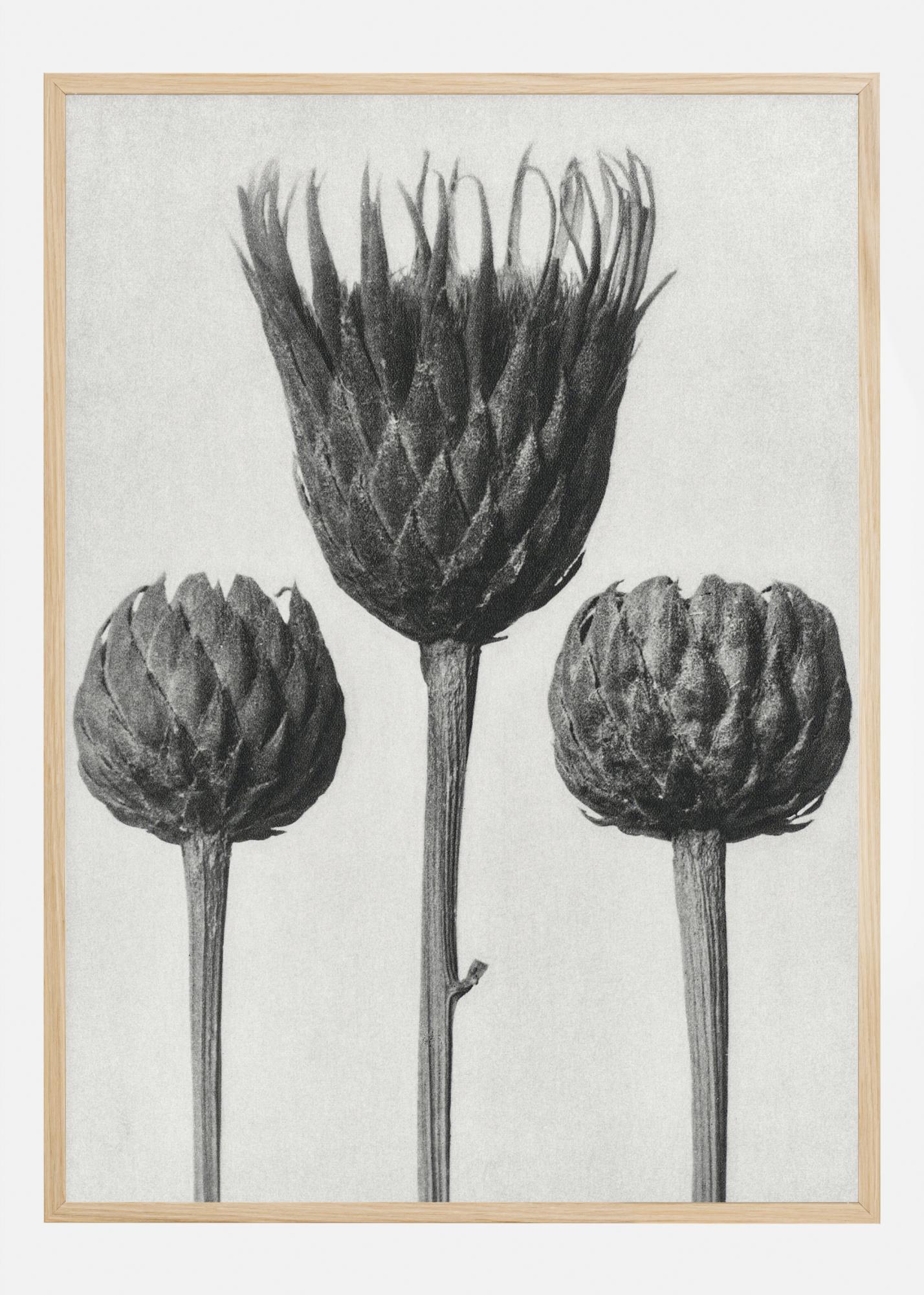 Luontojuliste, jossa on kolme yksivarsista harmaata kukkaa. Valkoisella pohjalla korkealla seisovat kolme harmaata kukkaa ovat lähes vierekkäin. Etualalla oleva harmaa kukka on avautunut enemmän kuin pienemmät kukat. Ihanteellinen tuloste ripustettavaksi talvipuutarhaasi.