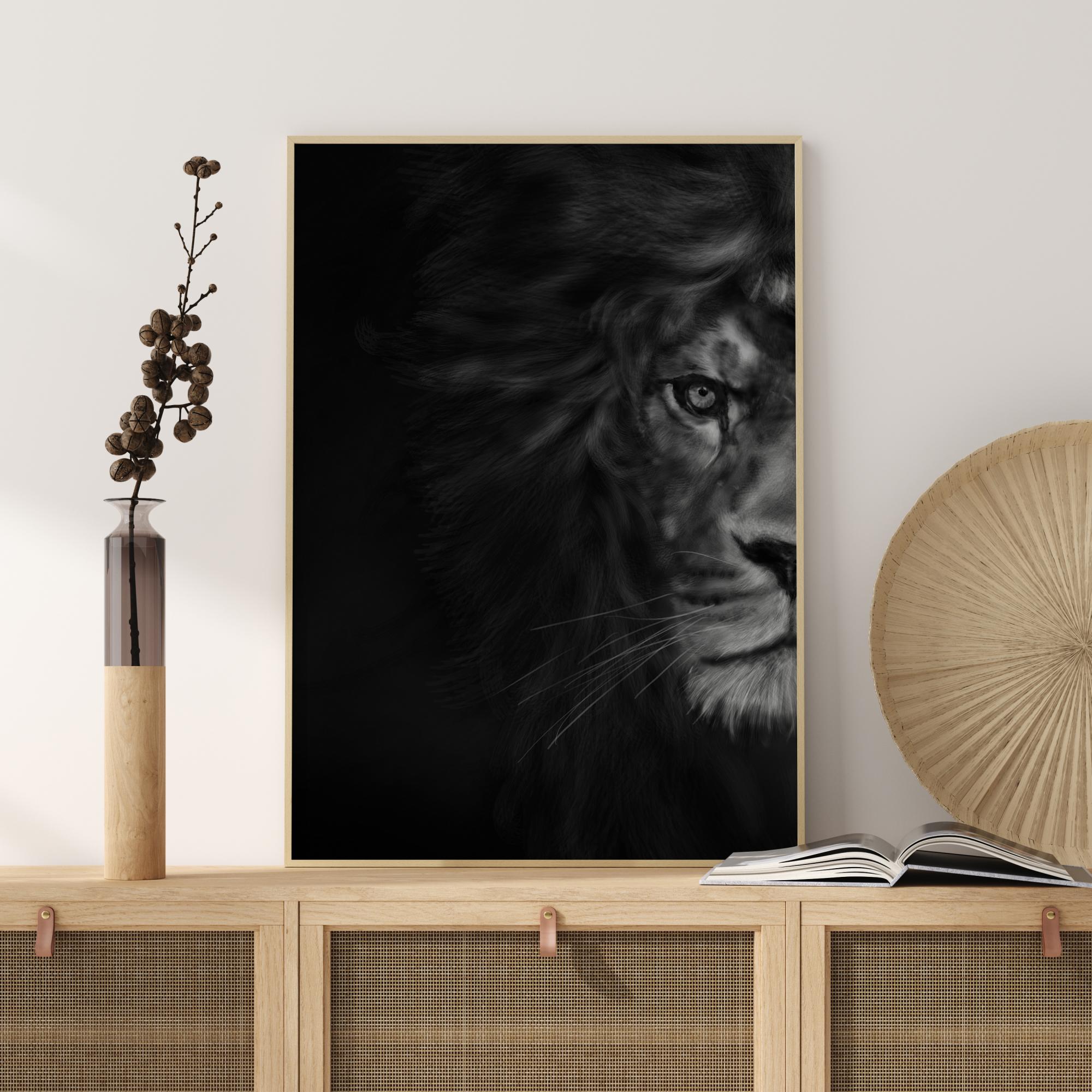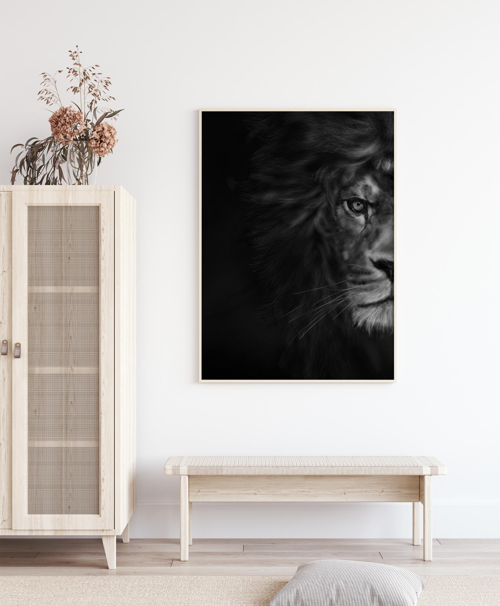 Vaikuttava mustavalkoinen luontokuva hurjasta leijonasta, joka tuijottaa suoraan kameraan. Tulosteen oikealle puolelle sijoitettuna vain puolet leijonan kasvoista näkyy. Kauniin aaltoilevan harjakarvansa ja majesteettisen asentonsa ansiosta leijona voidaan varmasti määritellä viidakon kuninkaaksi. Tuo safaritunnelma kotiisi.