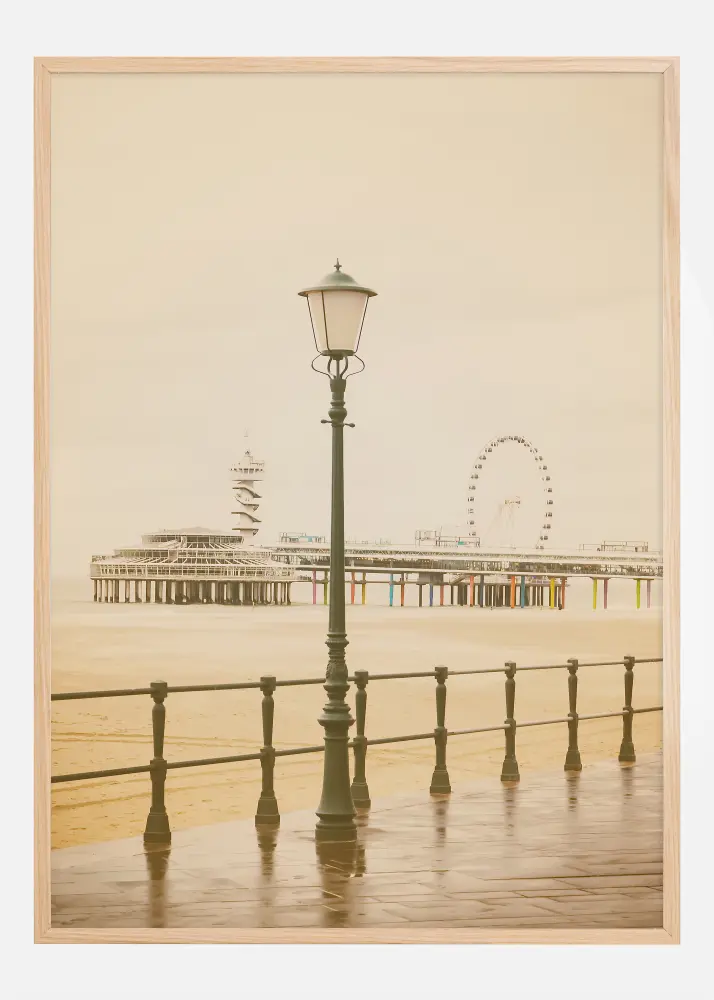 Tämä nostalginen juliste tuo mieleen hitaan, unenomaisen päivän meren äärellä. Vanhanaikainen lyhty seisoo etualalla, hiljainen vartija tyhjällä rantabulevardilla, jossa on sen klassinen balustradi. Taustalla näkyy laituri näkötorneineen ja suuri maailmanpyörä, joka lisää ajattoman huvipuistoromantiikan tuntua. Pehmeät seepia- ja beiget sävyt vahvistavat menneen ajan tuntua ja kutsuvat pohtimaan.