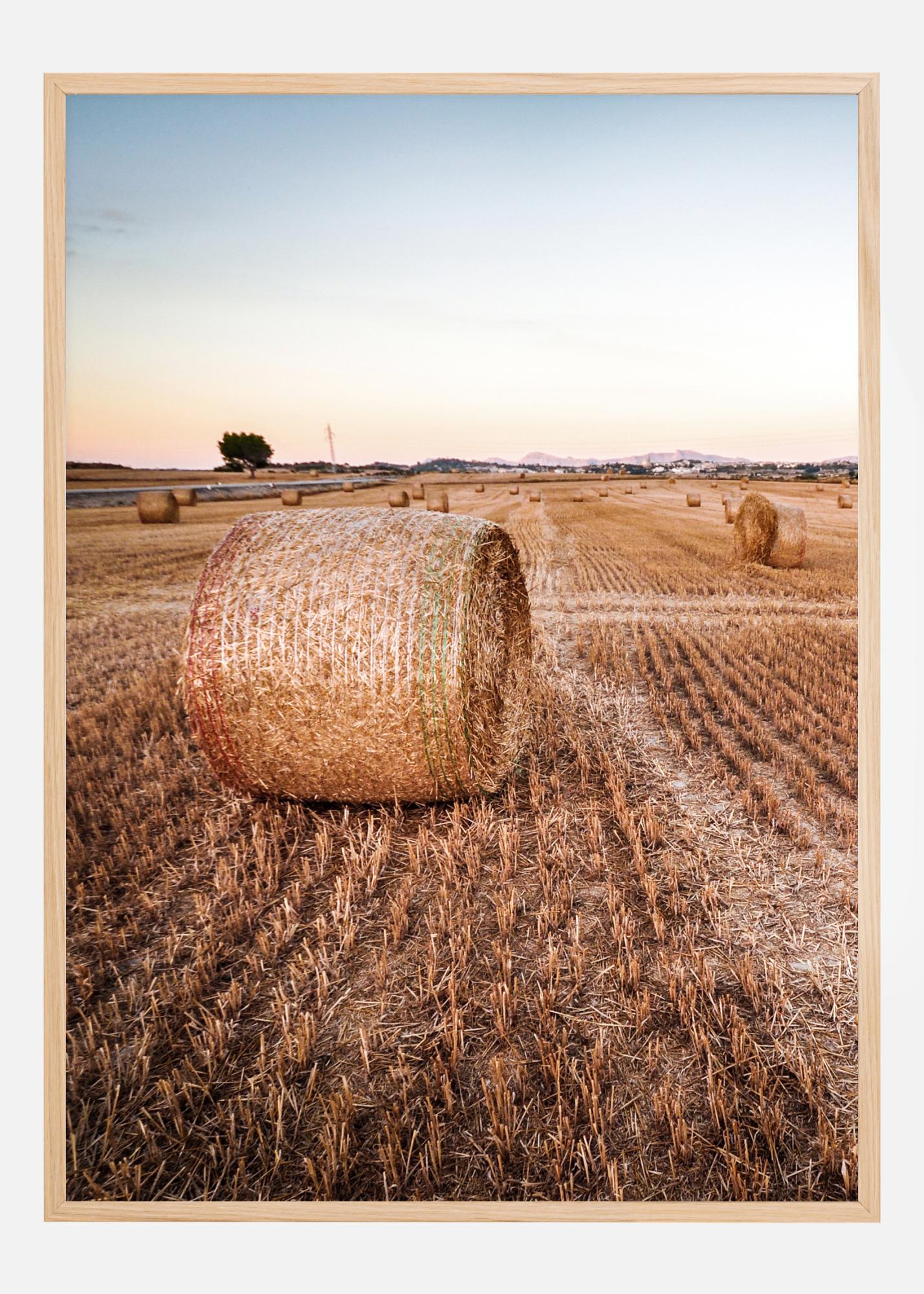 Yksinkertainen mutta kaunis luontokuva. Etualalla oleva heinäpaali on rullattu siististi valmiiksi sadonkorjuuta varten, kun taas kaukaisuudessa on muita rullattuja heinäpaaleja hajallaan pelloilla. Vaaleansininen taivas ja lämpimät ruskeat värit luovat lämpimän rentouttavan kuvan, joka sopii maalaiskeittiöön ripustettavaksi.