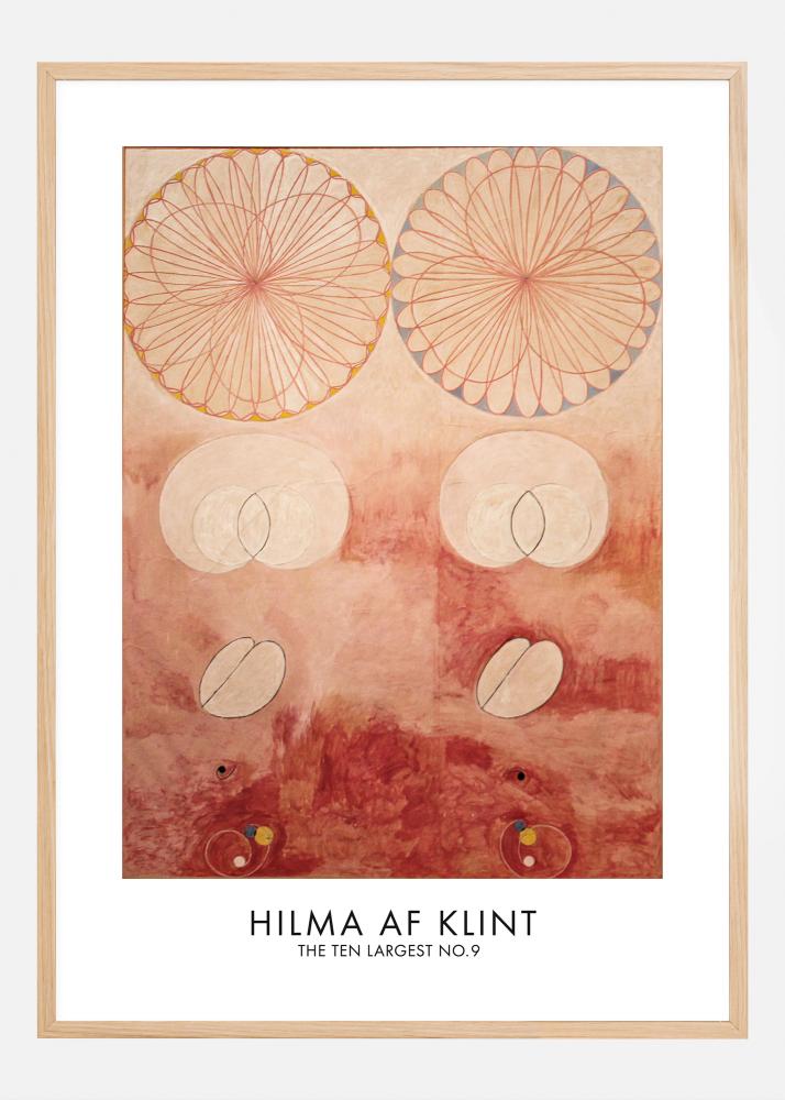 Tämä Hilma af Klintin 'De Tio Största No.9' -juliste on hypnoottinen sekoitus geometriaa ja orgaanisia muotoja, joka havainnollistaa taiteilijan kiehtomusta kosmiseen ja hengelliseen. Kaksi hallitsevaa ympyrää, täynnä säteileviä viivoja lämpimän vaaleanpunaisella ja terrakotanvärisellä taustalla, luovat välittömän visuaalisen vetovoiman. Näiden alapuolella on sarja pienempiä ympyröitä ja kierteisiä muotoja, jotka tuovat syvyyttä ja monimutkaisuutta sommitelmaan. Tämä taideprintti on heijastus af Klintin kyvystä yhdistää tiede ja hengellisyys yhdeksi ja samaksi kuva-alaksi tarjoten avoimen kentän tarkastelijan omille tulkinnoille ja sisäisille tutkimuksille.