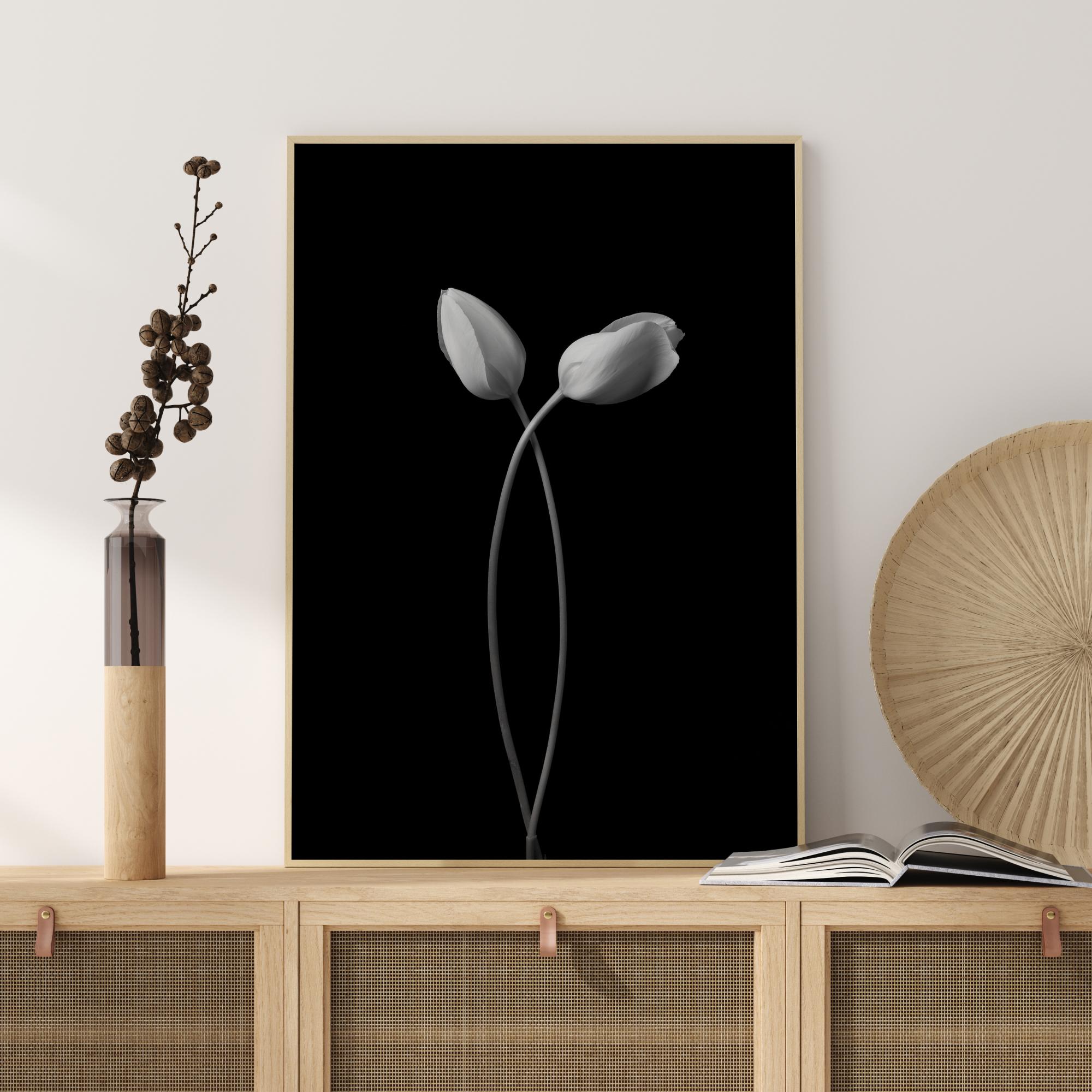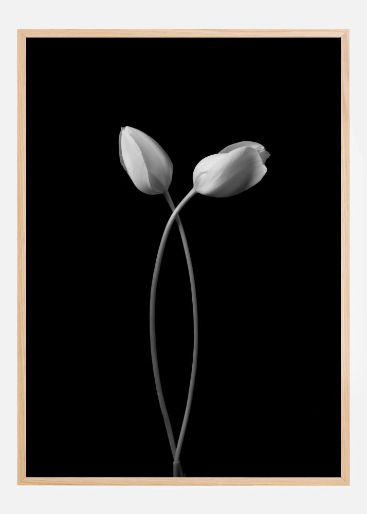 Tyylikäs juliste kahdesta tulppaanista, jotka halailevat toisiaan tavallisella mustalla pohjalla. Sijoita tämä keltaiselle seinälle ja lisää väriä tähän dramaattiseen kohtaukseen. Tunne yhteys luontoon tämän julisteen avulla.