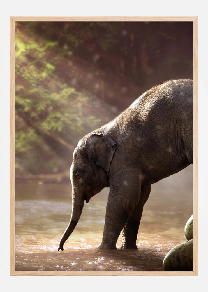 Suloinen kuva norsunpoikasesta, jota sen äiti rohkaisee menemään jokeen. Päivänvalo paistaa puiden läpi ja heijastuu veteen luoden lämpimän tunteen. Emo, joka ei uskalla mennä veteen, työntää vauvaansa varovasti pois kiviltä. Herttainen teos kuvastaa äidin ja vauvan välistä kiihkeää rakkautta.