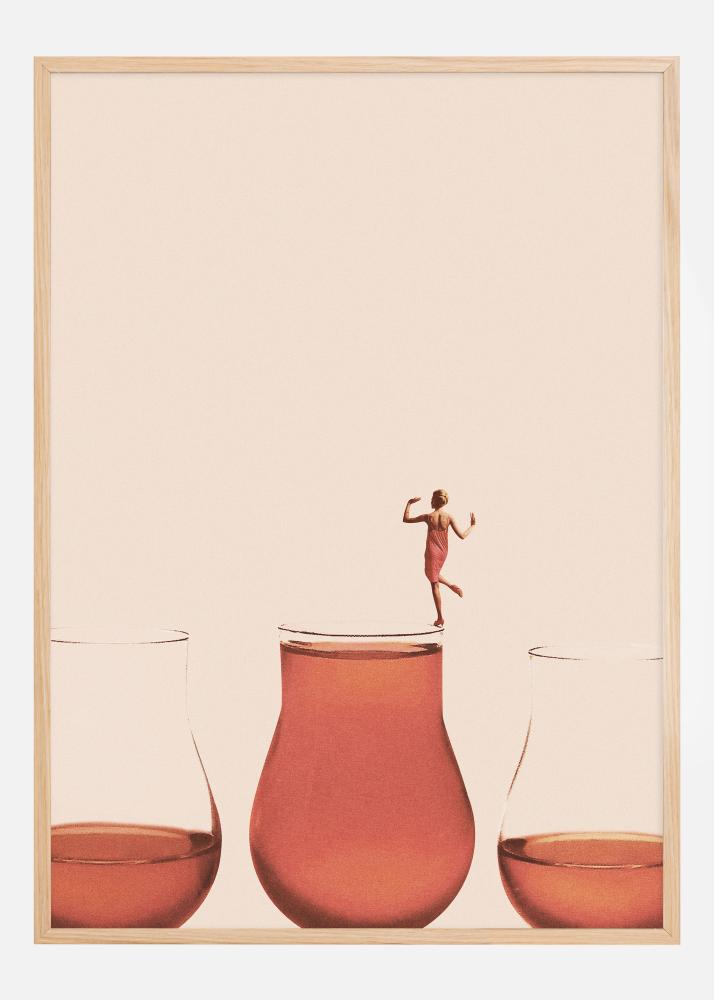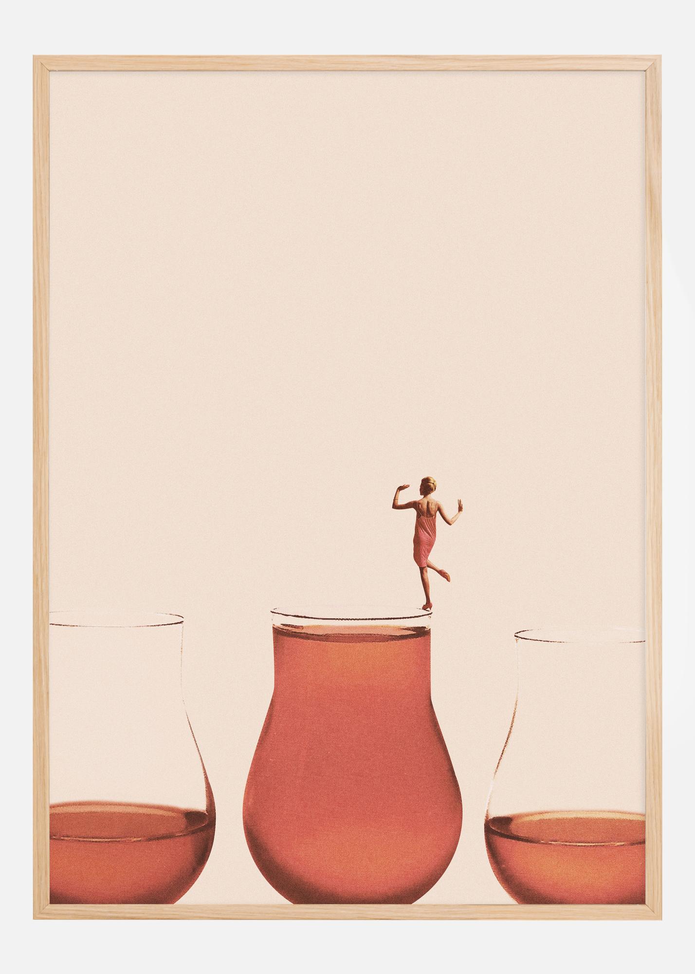 Tämä viljelty ja esteettisesti miellyttävä juliste kuvaa naisfiguuria, joka suorittaa herkän tasapainotemppunsa ylitäytetyn viinilasin reunalla. Nainen, puettuna mekkoon, vaikuttaa tanssivan tai liikkuvan ylevän sulavasti, kuva hallinnasta ja tarkkuudesta teossa, joka voi vaikuttaa riskialttiilta. Hänen siluettinsa toimii melkein kuin metafora hienostuneelle lähestymistavalle, jota tarvitaan nauttimaan elämän hienommista asioista, tasapainoisella arvostuksella sekä täyttä että tyhjää kohtaan.
