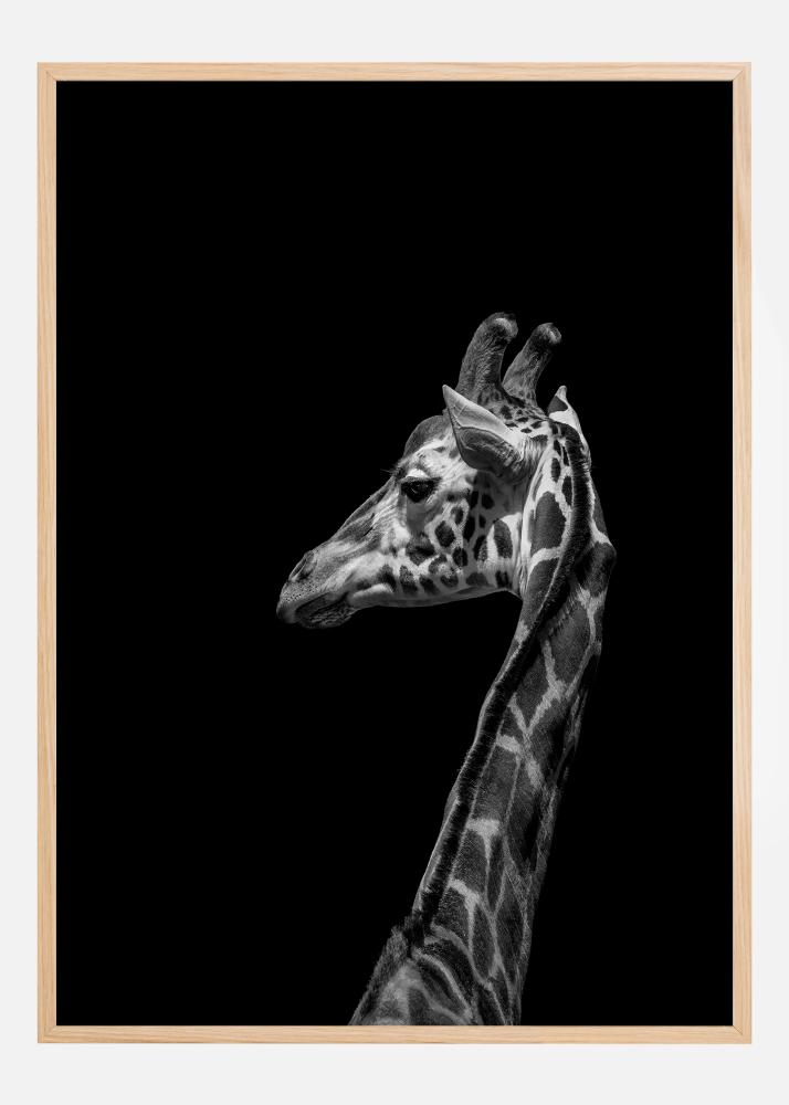 Tämä rohkea ja ilmeikäs juliste esittelee majesteettisen kirahvin sysimustaa taustaa vasten, luoden dramaattisen kontrastin, joka vangitsee katsojan huomion. Kirahvin ainutlaatuiset harmaasävykuviot on taitavasti tallennettu, jokainen täplä ja viiva korostuu yksityiskohtaisesti. Kirahvin ihon tekstuurin yksityiskohdat ja pehmeät harmaan sävyt mustaa taustaa vasten luovat lähes kolmiulotteisen vaikutelman.