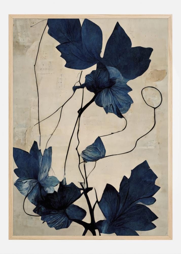 Tämä juliste vangitsee kiehtovan kasvitieteellisen kauneuden sen yksityiskohtaisella ja realistisella kukkien esityksellä syvän indigonsinisessä värissä. Lehtien ja kukkien intensiiviset ja tummat sävyt ovat kontrastina vanhentuneelle paperimaiselle taustalle, mikä antaa antiikkisen ja ajattoman tunnelman. Tämä printti on kunnianosoitus klassiselle kasvitieteelliselle kuvitukselle ja antaa elegantin ja hienostuneen vaikutelman mihin tahansa huoneeseen, mihin se sijoitetaan.