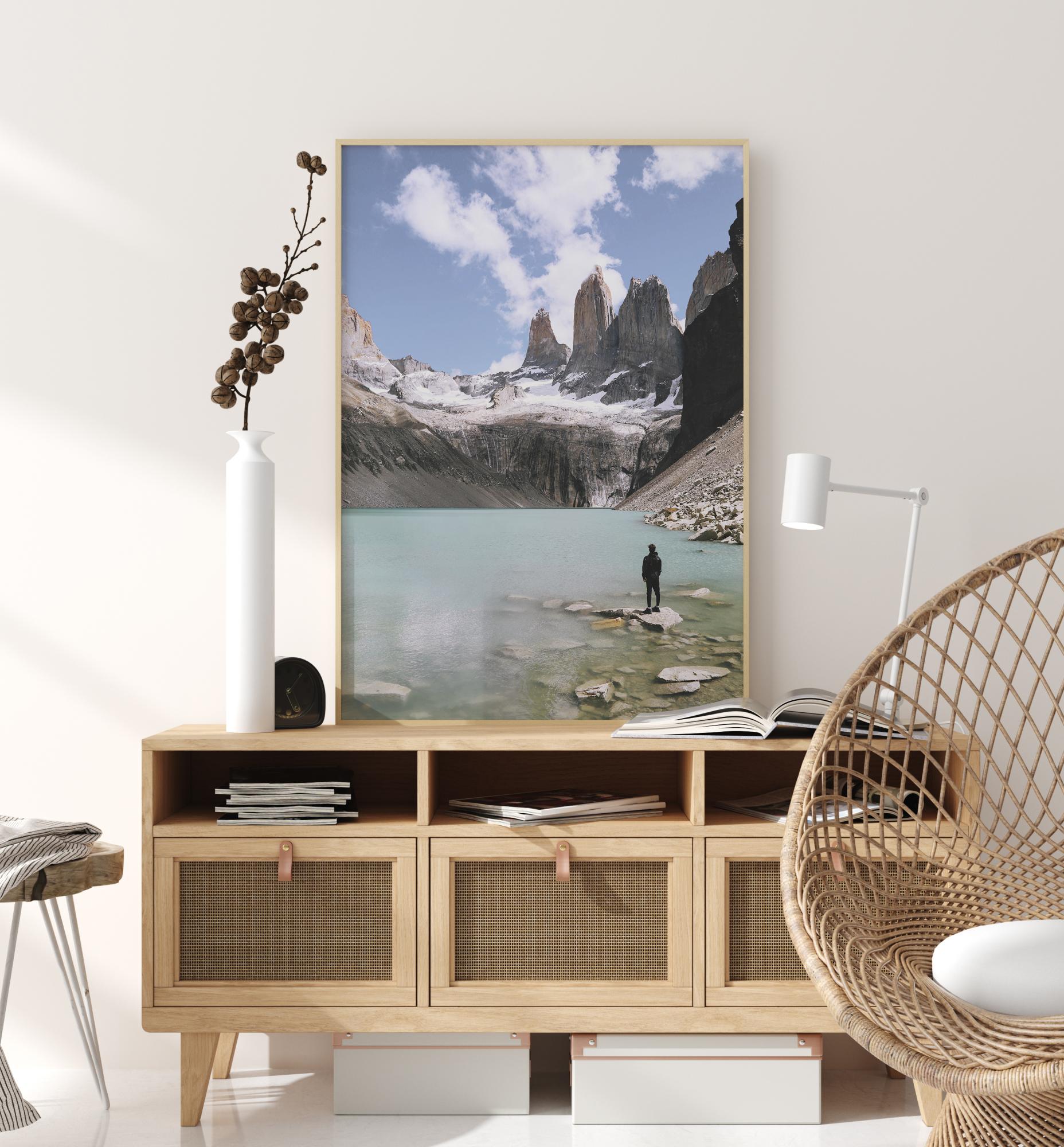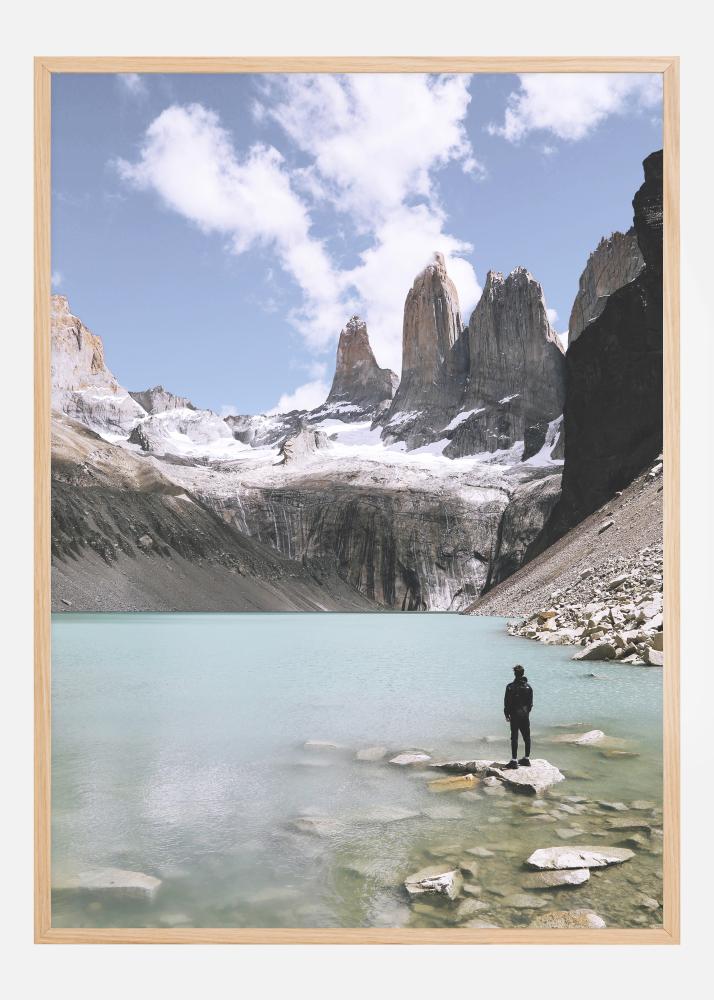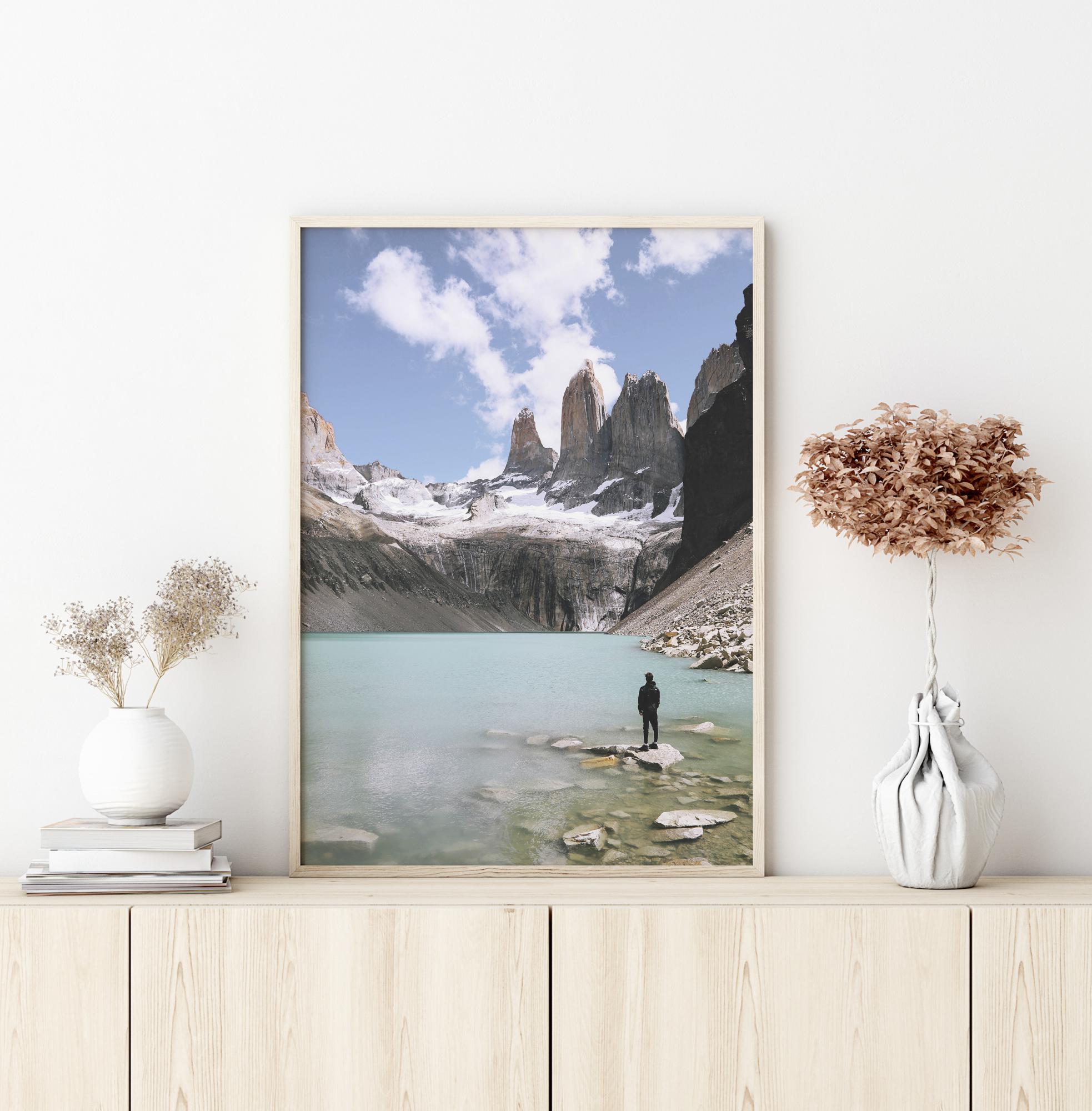 Luontojuliste, jossa yksinäinen hahmo tarkkailee henkeäsalpaavaa ympäristöä. Hahmo seisoo järven rannalla olevalla kivellä, ja mahtavat lumihuippuiset vuoret ympäröivät turkoosin väristä järveä. Voit melkein tuntea viileän ilman, joka välittyy tästä maagisesta kuvasta.