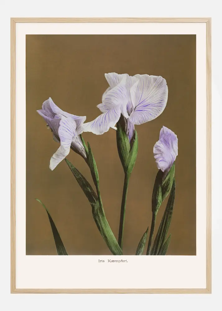 Tämä upea juliste kuvaa majesteetillista Iris Kaempferiä, joka tunnetaan myös nimellä japaniniris, ja esittelee ylpeänä sen erottuvat violetit ja valkoiset terälehdet. Herkät kukat vaihtelevissa violetin sävyissä, pastellista syvempiin violettiviivoihin, täydentyvät ohuilla linjoilla ja kuvioilla, jotka antavat tunteen hienostuneisuudesta ja yksityiskohtaisuudesta. Yhtenäistä kahvinsävyistä taustaa vasten kasvin siro muoto erottuu, tehden tästä printistä katseenvangitsijan jokaisessa sisustussuunnittelussa.