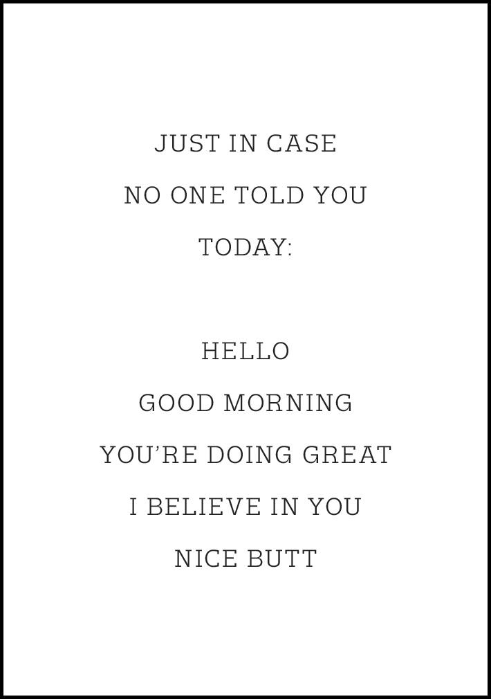 https://www.bga.fi/just-in-case-no-one-told-you-today51024499Just in case no one told you todayhttps://www.bga.fi/resource/u30L/SZn/08WVkLkpD7J/Affischer-Posters/2018-08/med-ram/quotes_mar_2018-2-19.jpghttps://www.bga.fi/resource/u4fv/WH7/k32KMd0PIEK/Prints/Category/quotes_mar_2018-2-19.jpg5.95EURDiscontinued/JulisteetUpea juliste koristamaan kotisi seinälle, käy yhtä hyvin yksin seinälle ripustettavaksi, kuin yhdessä muiden painotuotteiden kanssa tauluseinänä. Täydennä julistetta tyylipuhtaalla taulukehyksellä, joka sulautuu huoneen sisustukseen ja samalla korostaa motiivia luoden kauniin kokonaiskuvan ympäristöön.Juliste painetaan meidän omassa painatus-studiossamme, 230 gramman premium luokan, vanhentumattomalle paperille. Olemme valinneet mattapintaisen vahvan paksuuden, koska se antaa kauniin ja tasokkaan tulosteen ilman heijastuksia. Kun tulostamme tuotteen itse voimme myös omalta osaltamme vähentää ympäristövaikutuksia.Kehys ei sisälly, mutta voidaan tilata.Bildverkstad13x18 cm13x18 cm2018-08-14T21:23:07+02:00