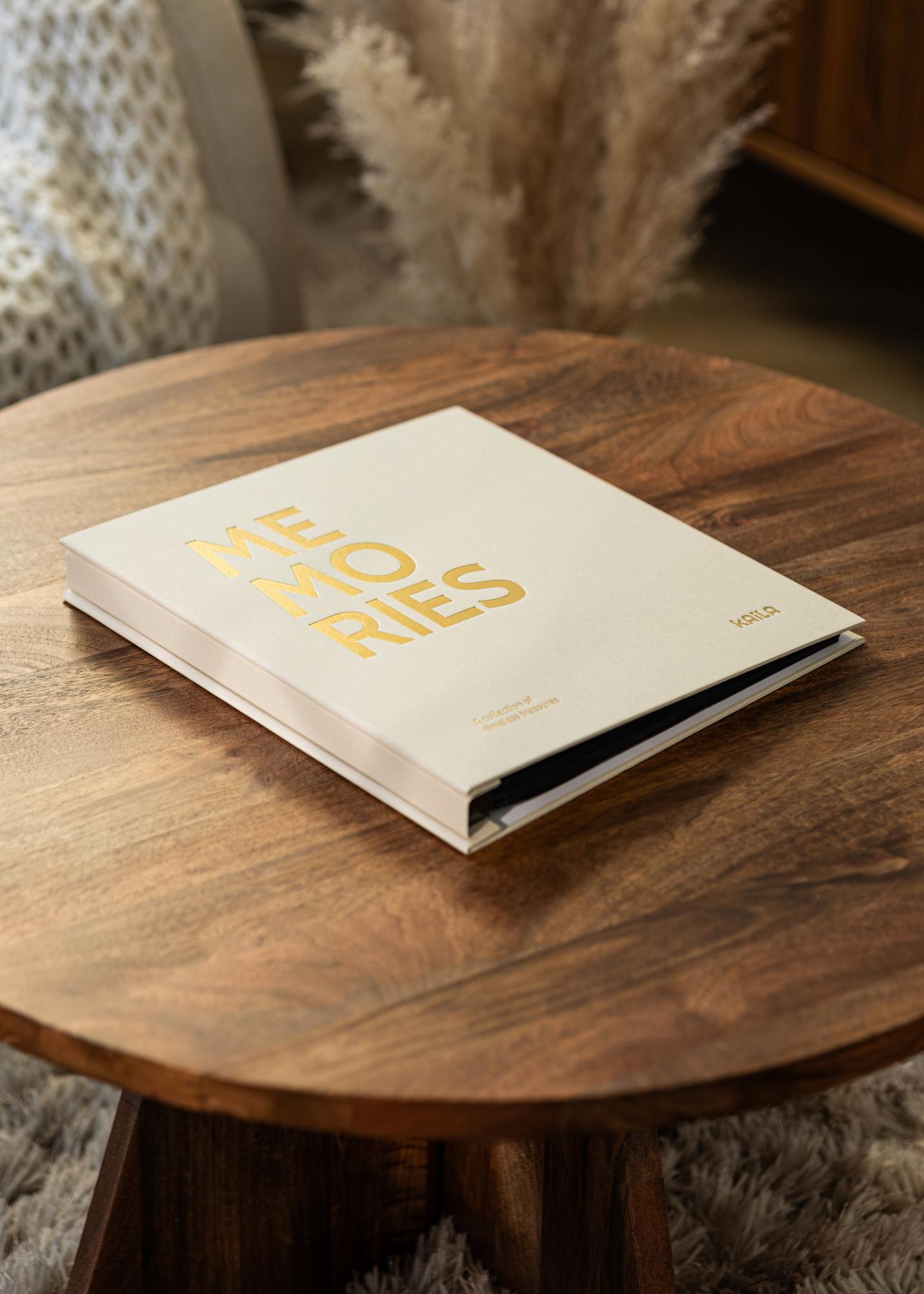 Tämä on tyylikäs valokuva-albumi ajattomalla designilla ja käytännöllisillä valokuvataskuilla – täydellinen sinulle, joka haluat säilyttää parhaat valokuvamuistosi tyylikkäästi ja helposti. Albumi on päällystetty beige tekstiilillä ja sen etusivua koristaa teksti ”MEMORIES” kultaisella painatuksella. Lisätunnelmaa varten albumissa on myös alateksti ”A collection of timeless treasures” kirjoitettuna yhteen kulmaan. Tekstiilipäällysteiset kannet yhdessä tekstin kultaisen värin kanssa tekevät valokuva-albumista ylellisen sisustusyksityiskohdan, jonka haluat pitää esillä.
