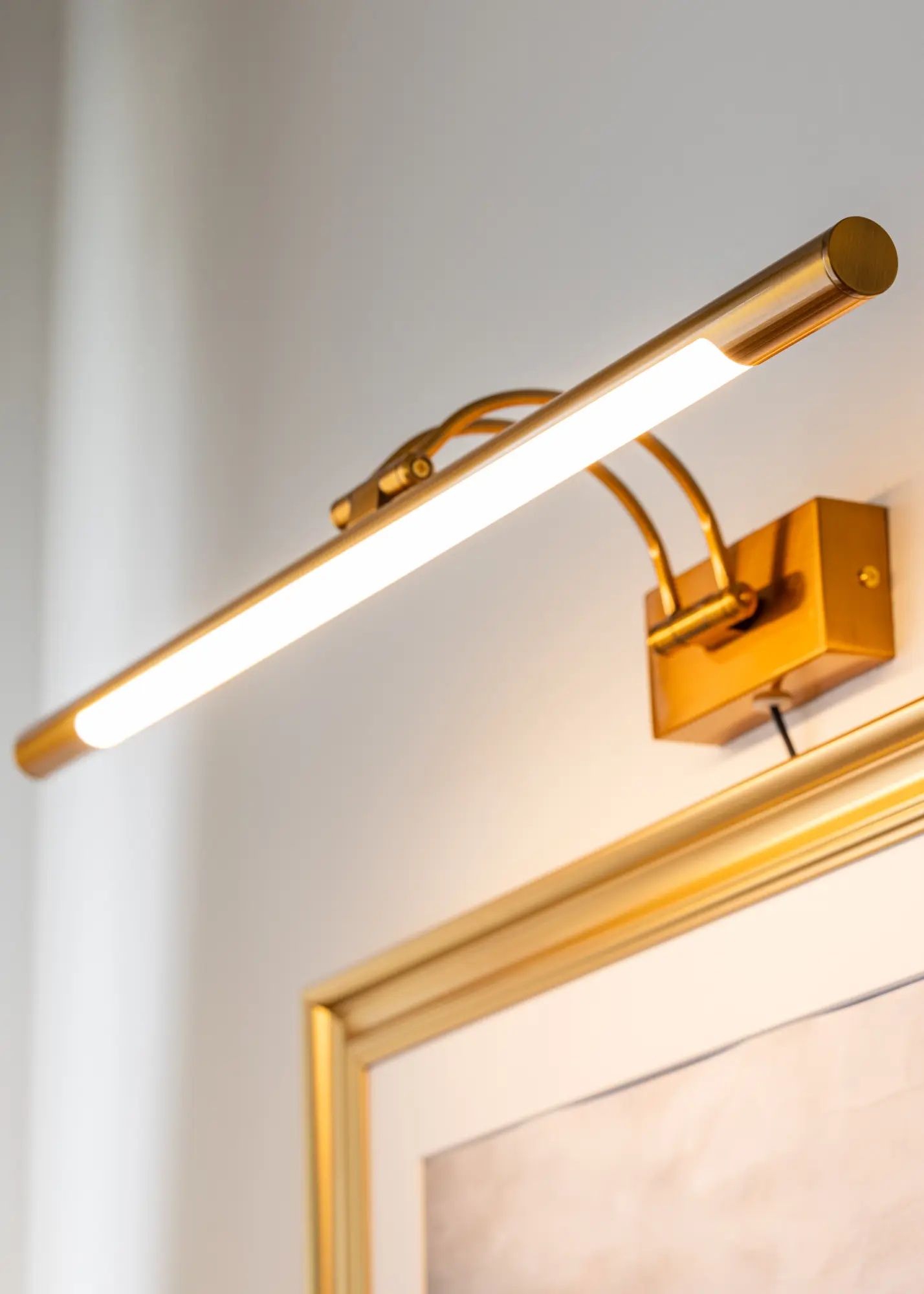 Tämä tyylikäs tauluvalaisin messinkistä tarjoaa huomaamattoman ja elegantin ratkaisun taideteosten ja valokuvien valaisemiseen tavalla, joka tuo esiin yksityiskohdat ilman, että se hallitsee huonetta. Syvyydeltään 19 cm ja pituudeltaan 68 cm, se on ihanteellinen valaisemaan kuvia, joiden leveys on enintään 110 cm. Sisäänrakennettu LED-valonlähde, jonka värilämpötila on 3000K, antaa miellyttävän lämmintä valoa, joka on riittävän pehmeä luomaan kutsuvan ilmapiirin olematta kuitenkaan liian hallitseva.