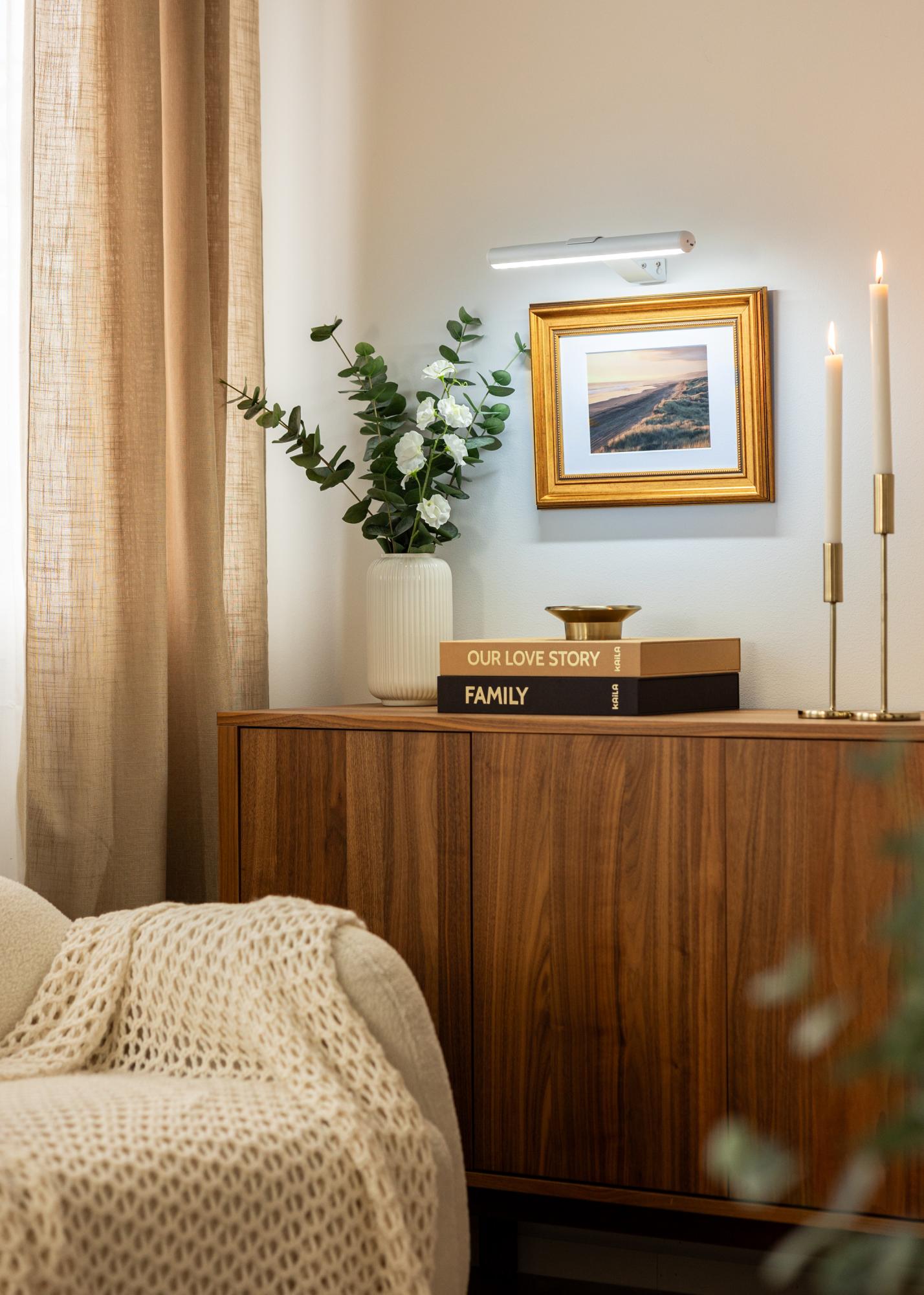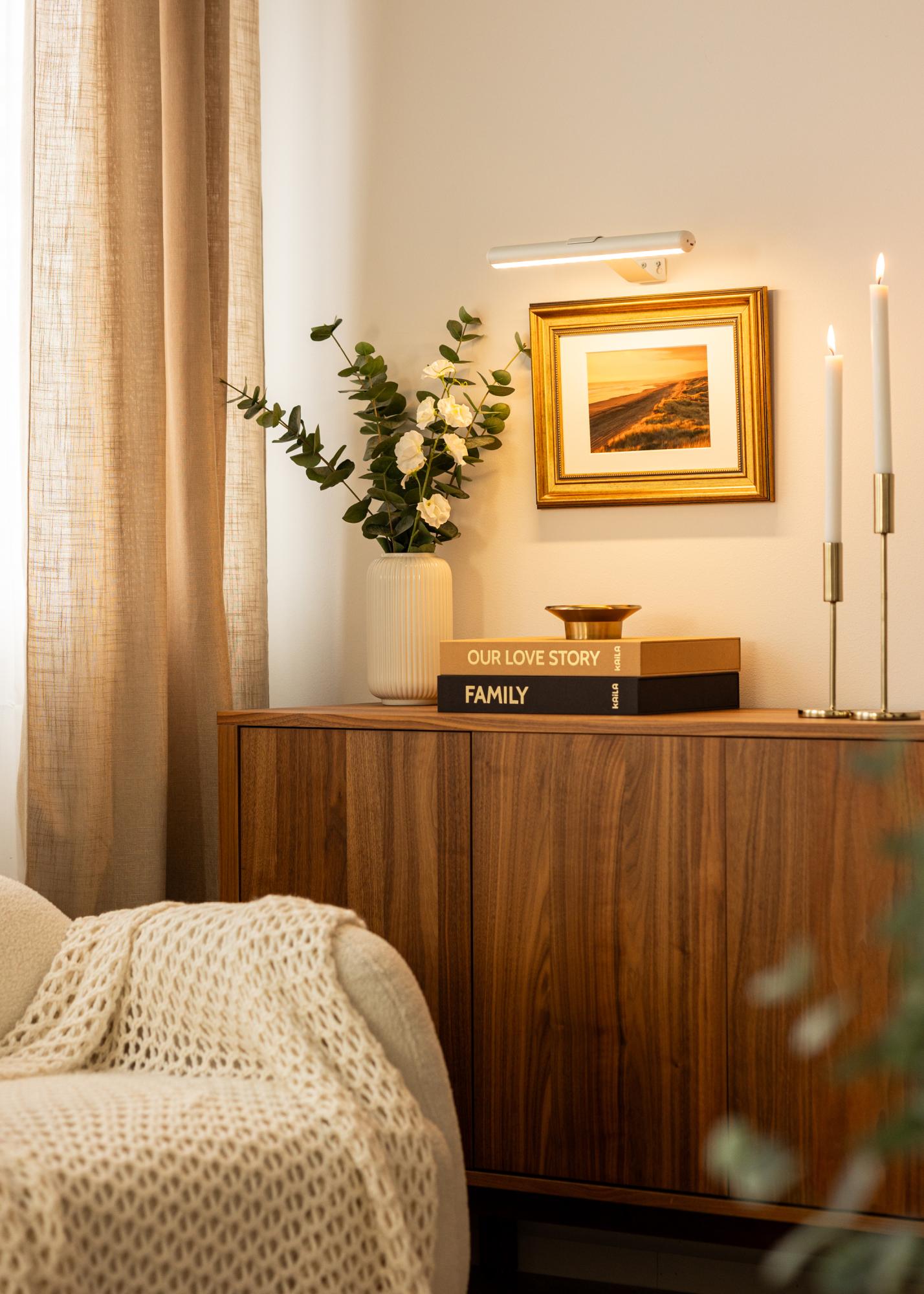 Valkoinen väri ja minimalistinen muotoilu tekevät tästä tauluvalaistuksesta sellaisen, joka sulautuu eri tyyppisiin sisustuksiin, samalla kun se korostaa taideteoksiasi huomaamattomalla ja tyylikkäällä tavalla. Se on helppo asentaa ja toimitetaan tarvittavien ruuvien kanssa nopeaa ja yksinkertaista asennusta varten. Tämä on ihanteellinen ratkaisu antaaksesi taideteoksillesi ansaitsemansa huomion.