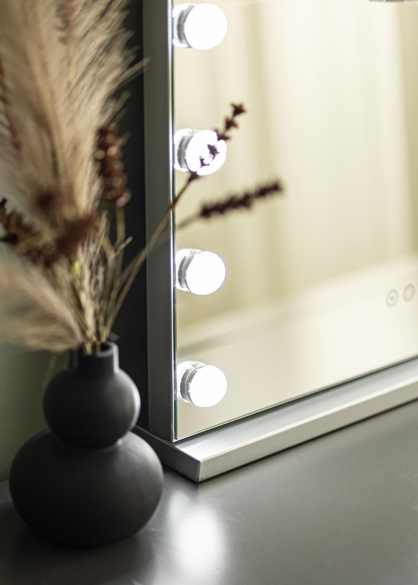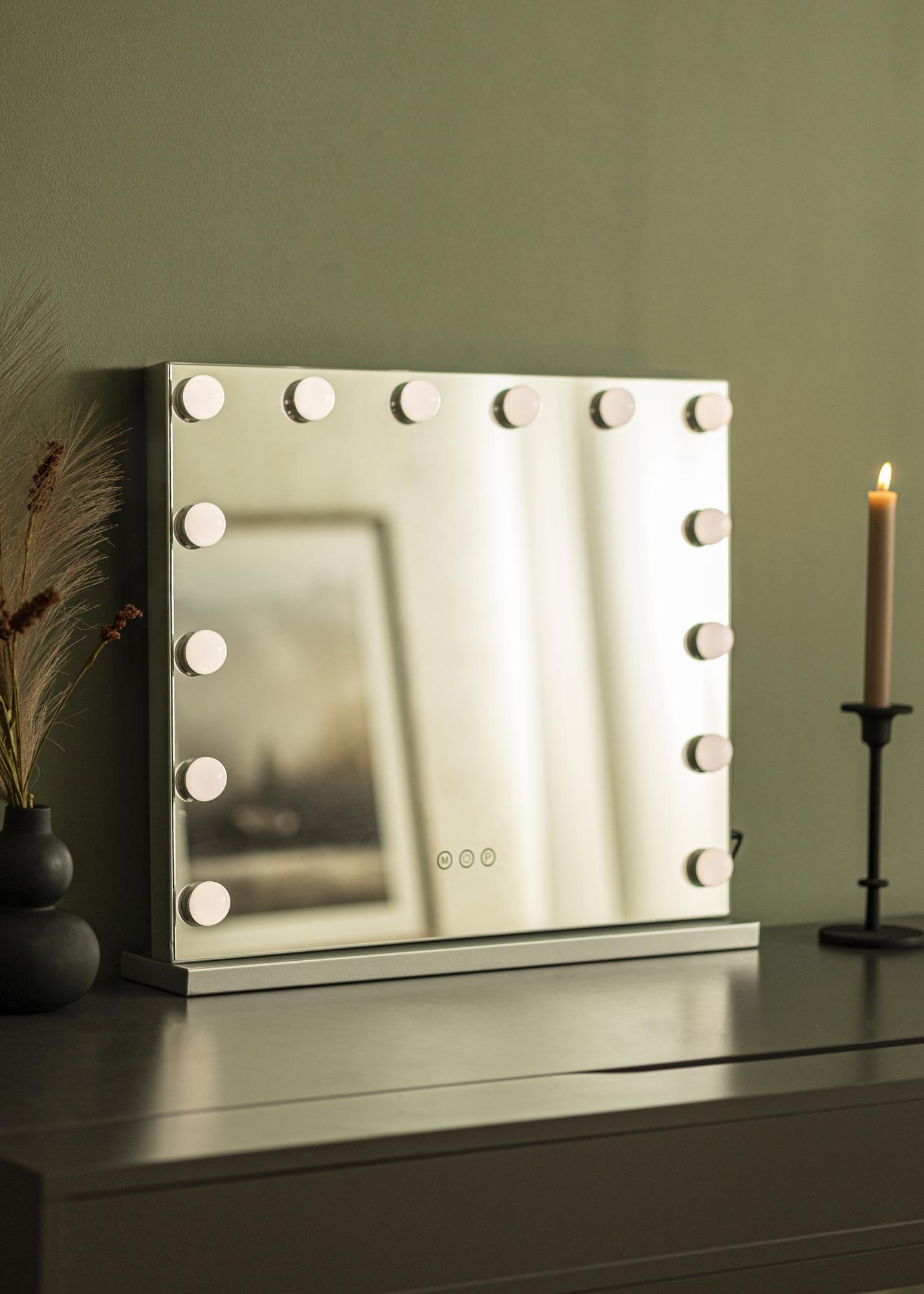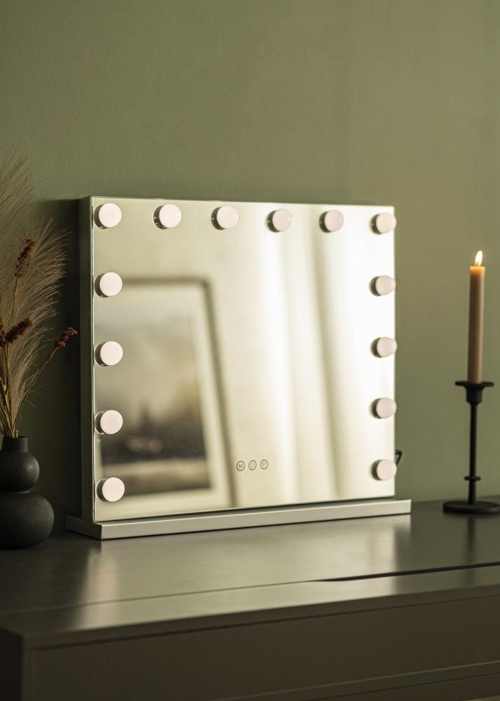 Tässä meikkipeilissä on tyylikäs muotoilu, ajaton suorakulmainen muoto ja 14 LED-lamppua, jotka valaisevat sinua hyvin kun meikkaat. Lamput on asetettu kehyksen tavoin ympäri 56x46 cm kokoista peilipintaa. Valoa voi himmentää ja voit myös säätää värilämpötilaa. Himmentääksesi valoa pidä “P”-nappia pohjassa ja säätääksesi värilämpötilaa 3000K-6000K:n välillä, pidä “M”-nappia pohjassa. Peilissä on kosketusnäppäin myös valon sytyttämiseen ja sammuttamiseen. Peili liitetään pistorasiaan.