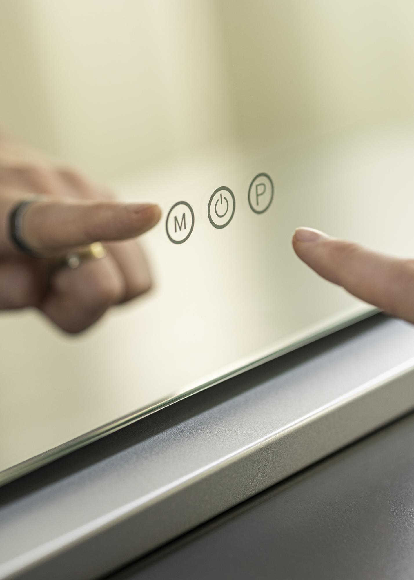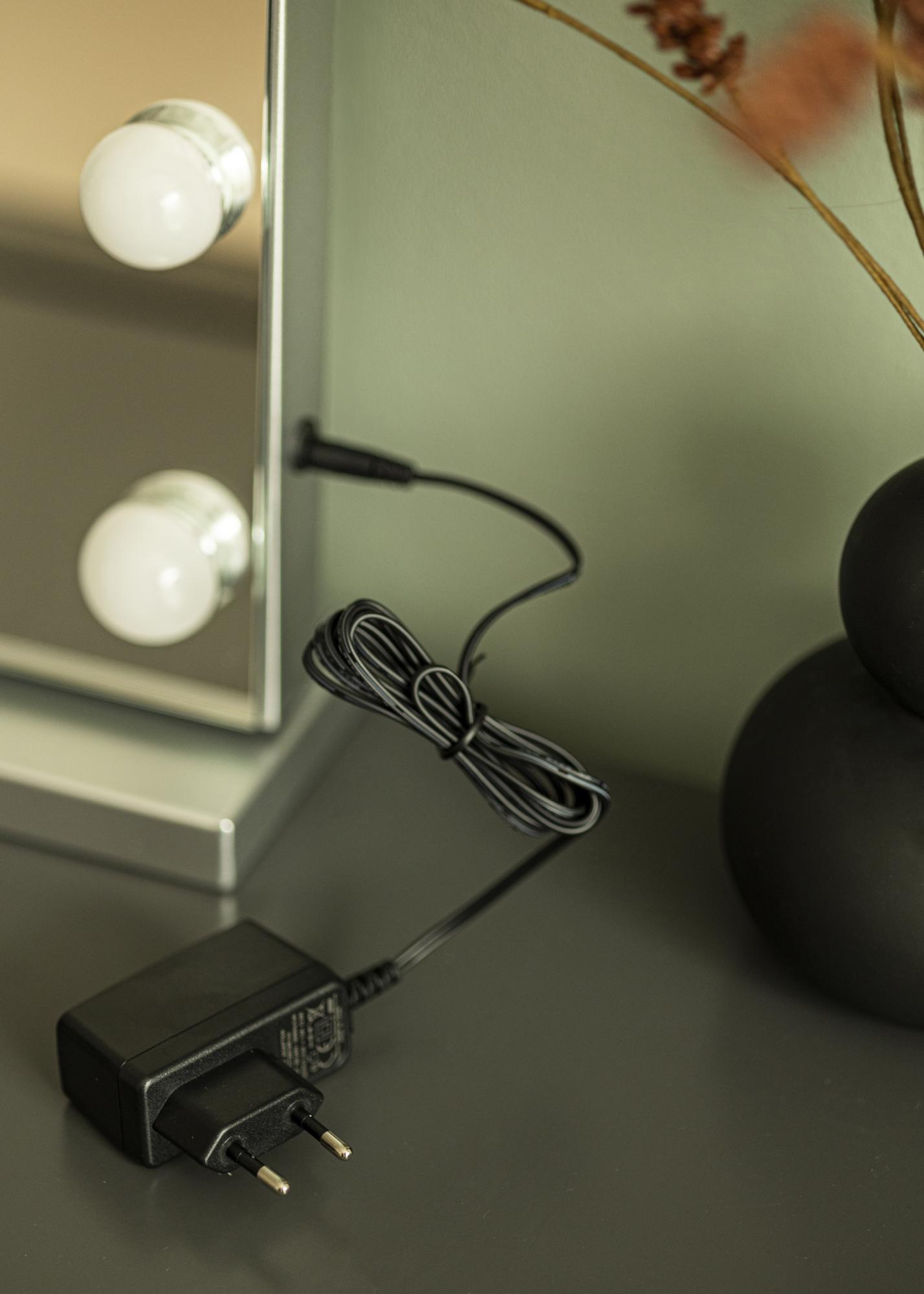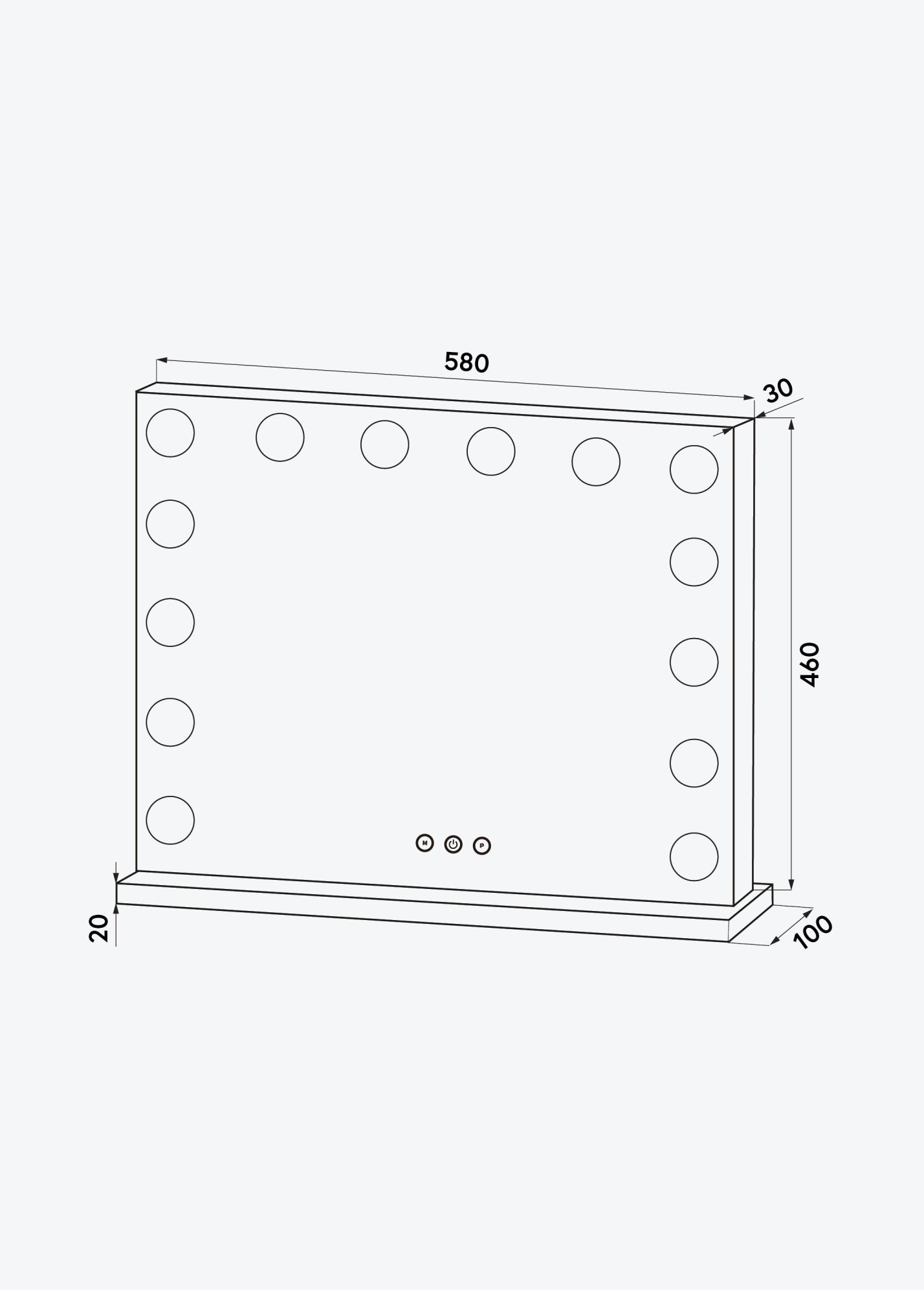Tässä meikkipeilissä on tyylikäs muotoilu, ajaton suorakulmainen muoto ja 14 LED-lamppua, jotka valaisevat sinua hyvin kun meikkaat. Lamput on asetettu kehyksen tavoin ympäri 56x46 cm kokoista peilipintaa. Valoa voi himmentää ja voit myös säätää värilämpötilaa. Himmentääksesi valoa pidä “P”-nappia pohjassa ja säätääksesi värilämpötilaa 3000K-6000K:n välillä, pidä “M”-nappia pohjassa. Peilissä on kosketusnäppäin myös valon sytyttämiseen ja sammuttamiseen. Peili liitetään pistorasiaan.